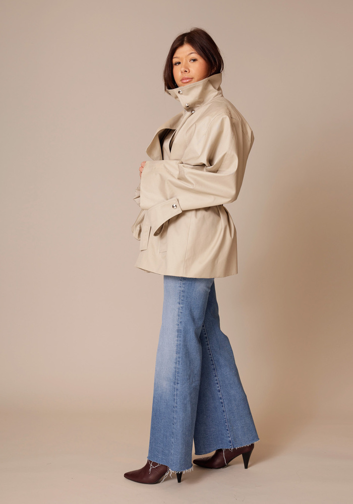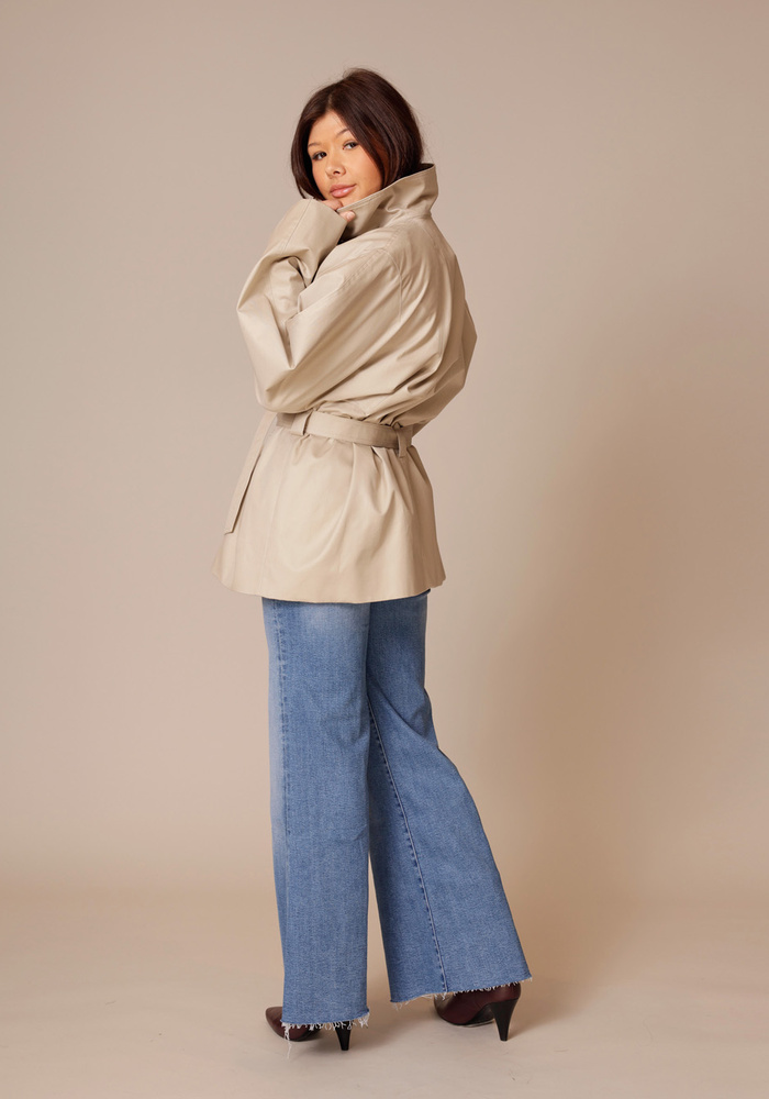 De Ralya korte trenchcoat van Iro heeft een gestructureerde snit en vastgemaakt met drukknopen en een strikriem in de taille. Opstaande kraag vastgemaakt met drukknopen en een regenflap aan de rechtervoorkant. Verstelbare manchetten met drukknoopjes en raglanzakken.