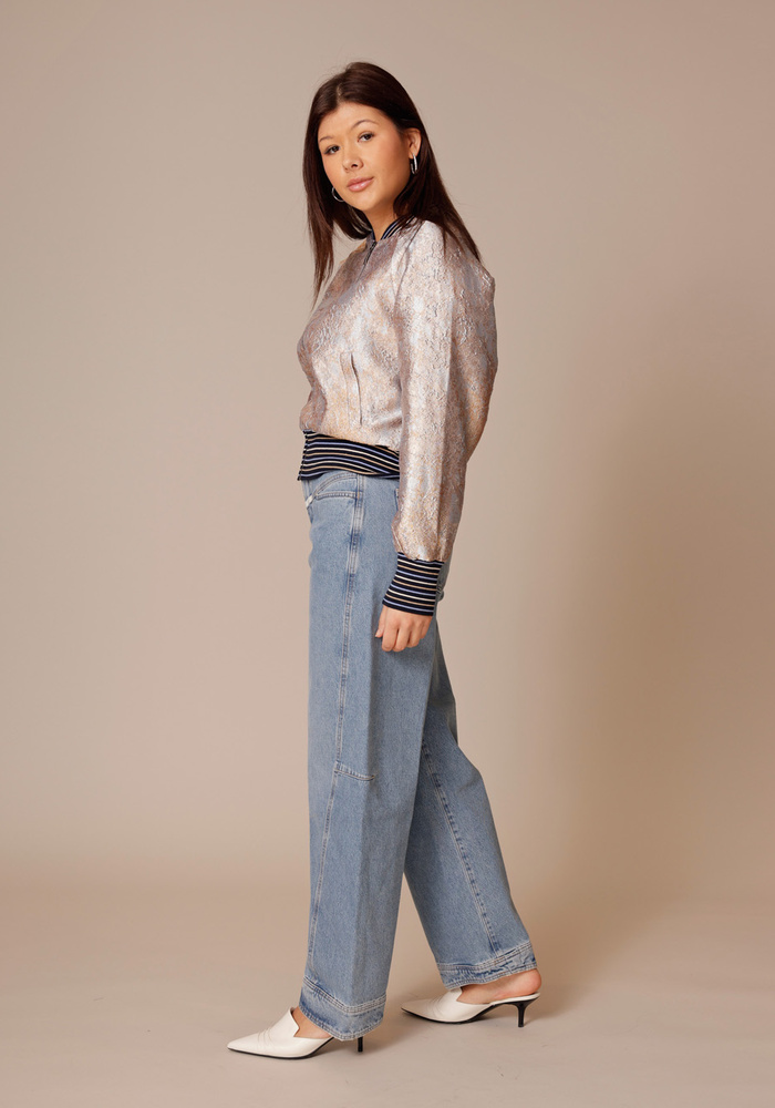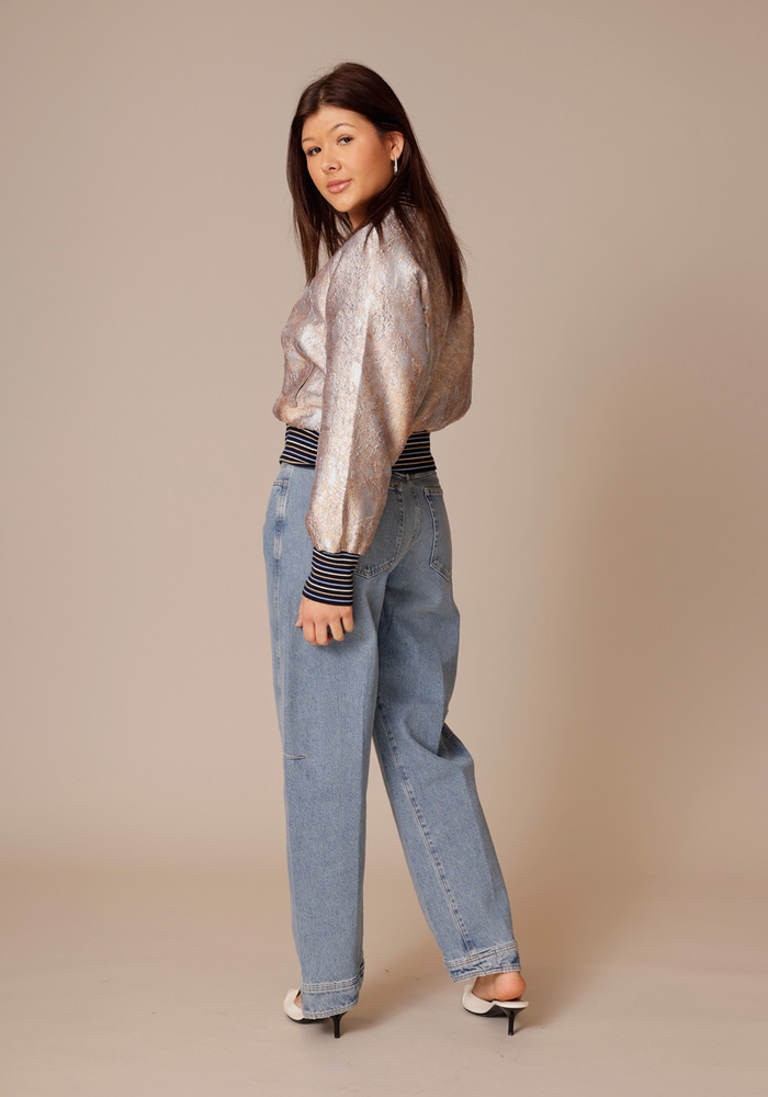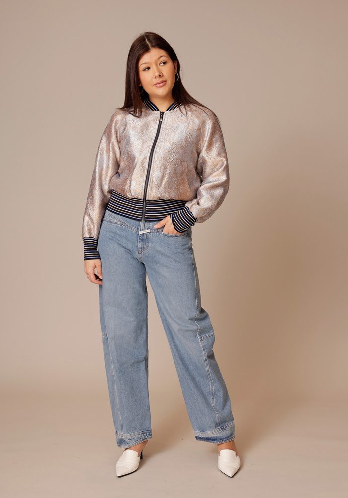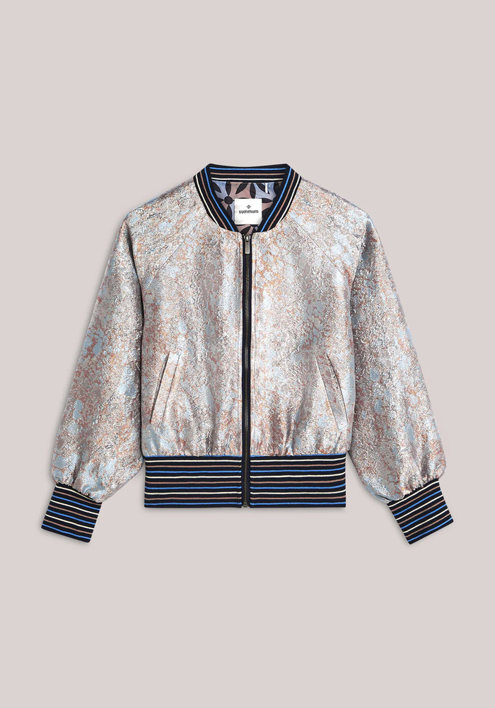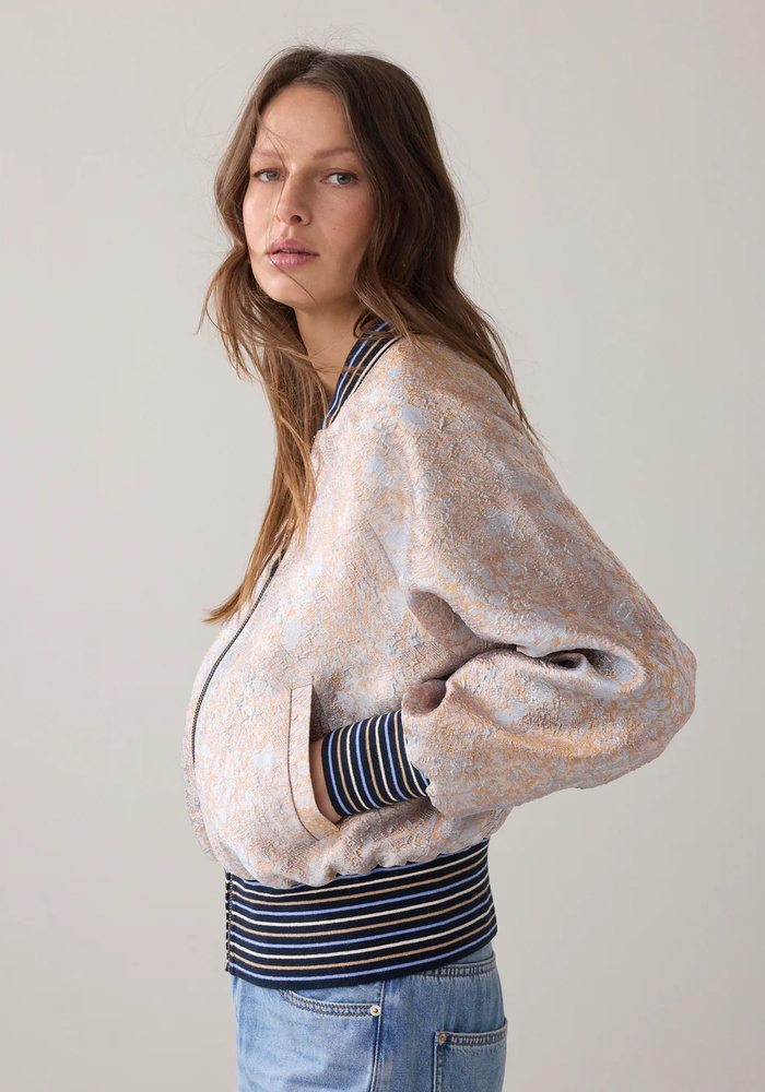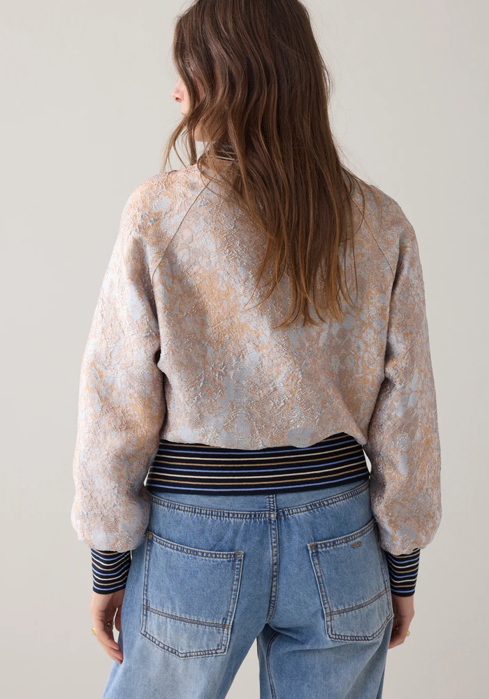 Deze bomberjasje van jacquard met gouden accenten. Het model is uitgevoerd met raglanmouwen, een brede gestreepte boord aan de onderkant en bij de manchetten, en is afgewerkt met een contrasterende voering.