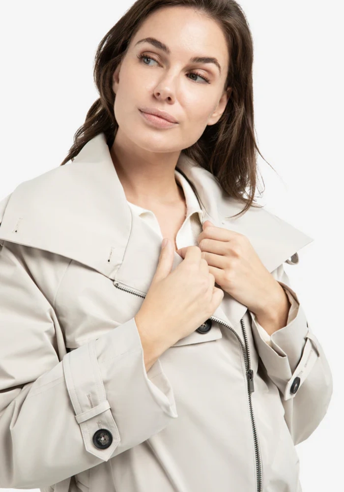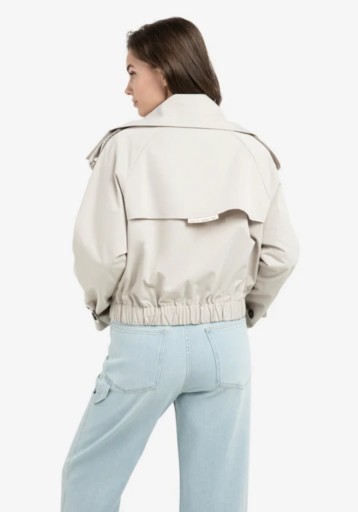 Dit korte jack combineert trenchcoat-elementen met een moderne bomberstijl. Het is voorzien van een opstaande kraag, epauletten en een schouderoverslag voor een stijlvolle, functionele look. De elastische tailleband en manchetten geven een eigentijds accent, terwijl het kleine label op de rug een subtiel detail toevoegt. Gemaakt van gladde geweven stof, ideaal voor het tussenseizoen.