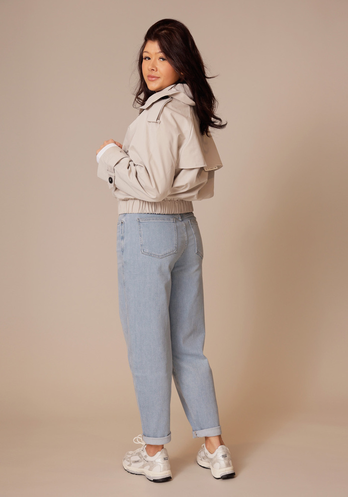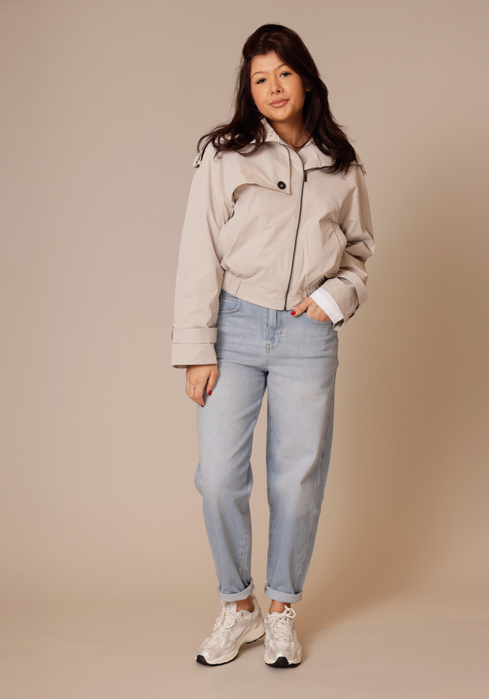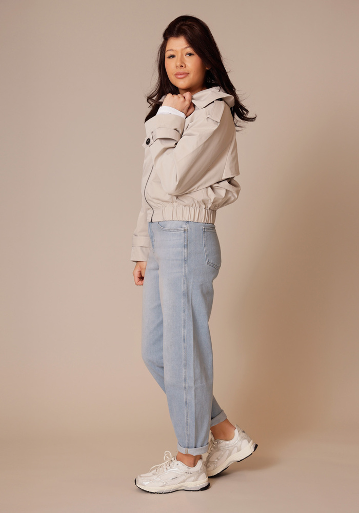 Dit korte jack combineert trenchcoat-elementen met een moderne bomberstijl. Het is voorzien van een opstaande kraag, epauletten en een schouderoverslag voor een stijlvolle, functionele look. De elastische tailleband en manchetten geven een eigentijds accent, terwijl het kleine label op de rug een subtiel detail toevoegt. Gemaakt van gladde geweven stof, ideaal voor het tussenseizoen.