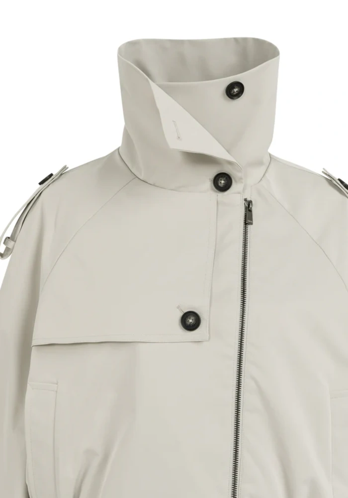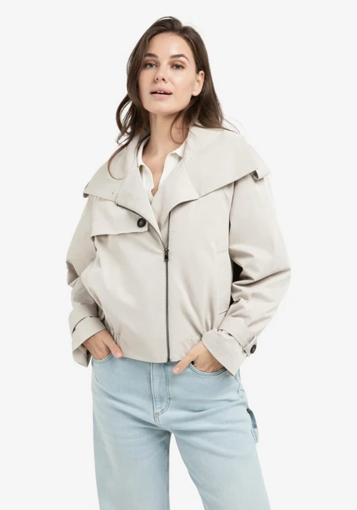 Dit korte jack combineert trenchcoat-elementen met een moderne bomberstijl. Het is voorzien van een opstaande kraag, epauletten en een schouderoverslag voor een stijlvolle, functionele look. De elastische tailleband en manchetten geven een eigentijds accent, terwijl het kleine label op de rug een subtiel detail toevoegt. Gemaakt van gladde geweven stof, ideaal voor het tussenseizoen.