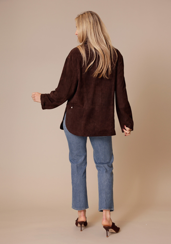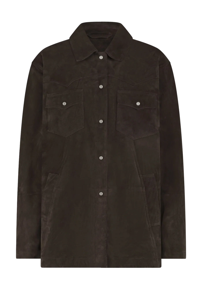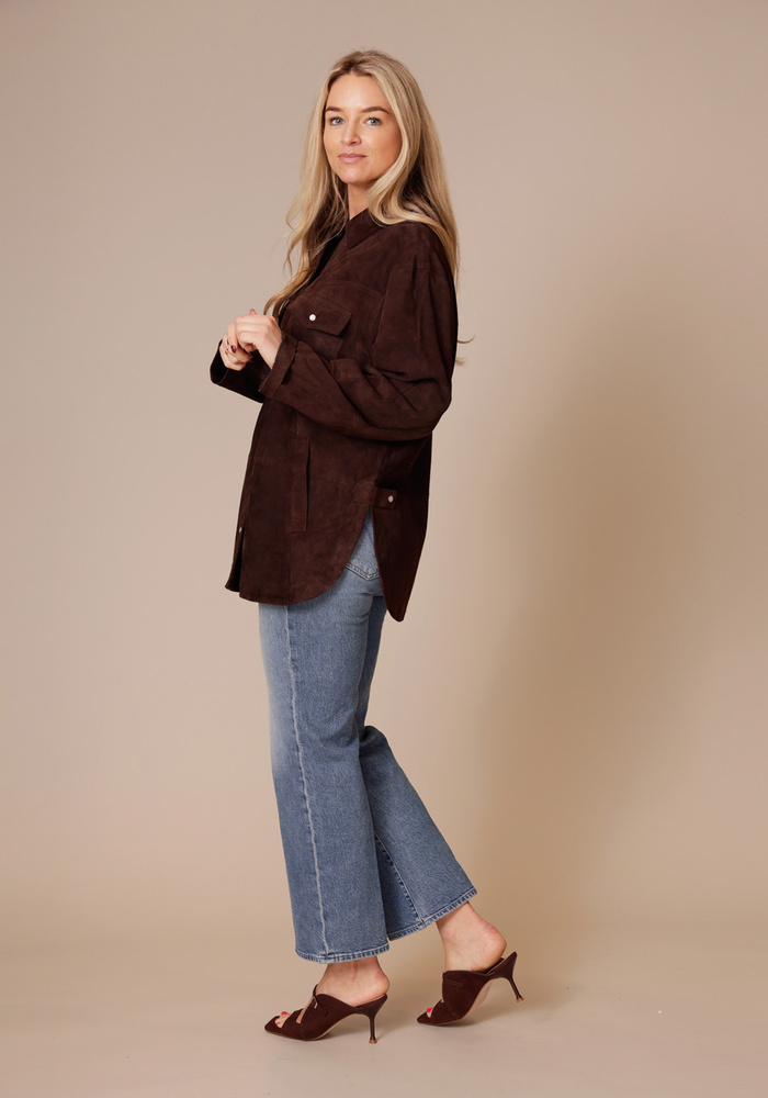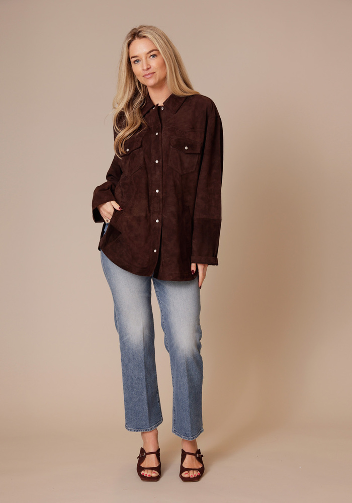 Deze suède overshirt straalt moeiteloze, stijlvolle elegantie uit met een subtiele Western-inspiratie. De zachte kwaliteit, parelmoeren knopen en relaxte pasvorm maken het perfect om in laagjes te dragen.