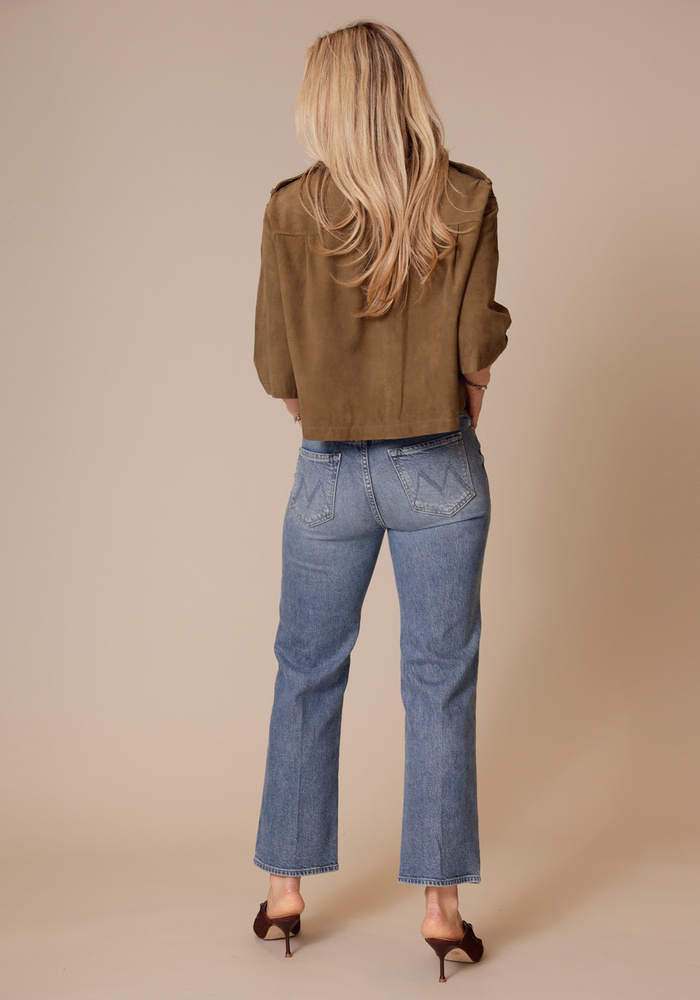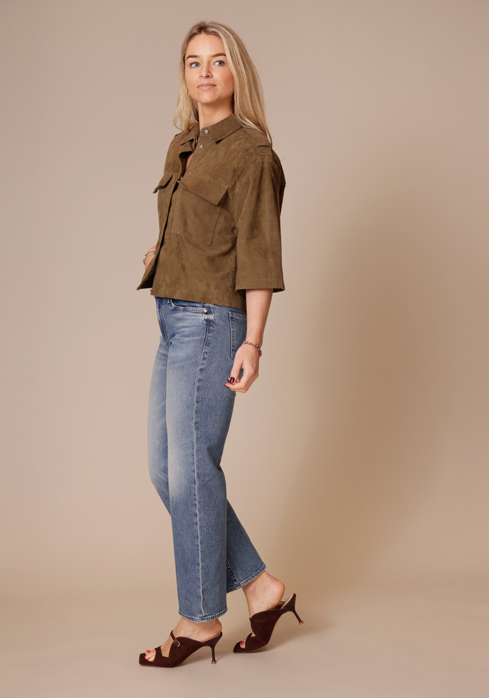 De Nala blouse van Alter Ego heeft korte mouwen en is gemaakt van suede met drukknoopjes.