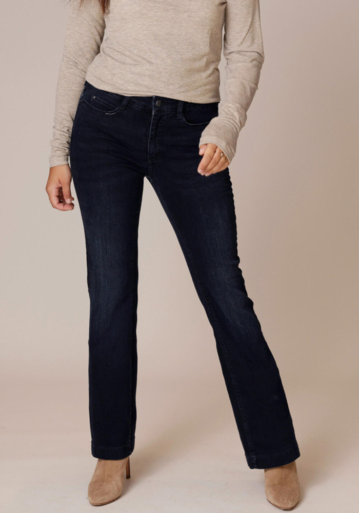De Dream boot jeans van Mac is een donkerblauwe jeans met een flared fit. De broek is een 5-pocket model en heeft een normale taillehoogte.
