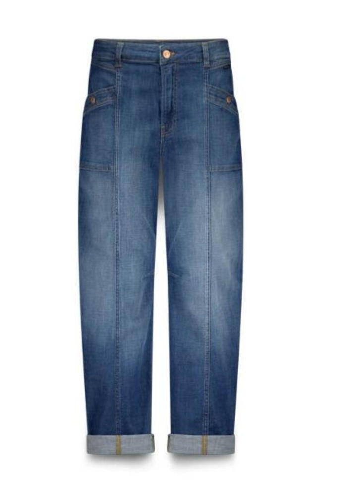 De Tapered jeans van Summum is heeft een lage taille en heeft boven een aangesloten pasvorm. De jeans heeft een knoop -en ritssluiting.