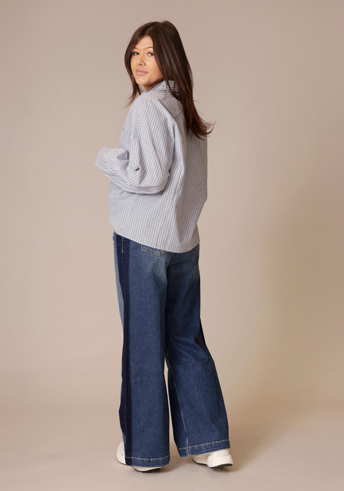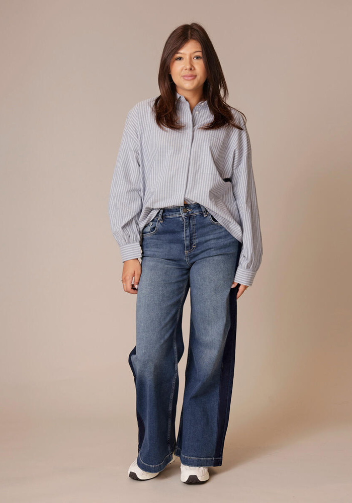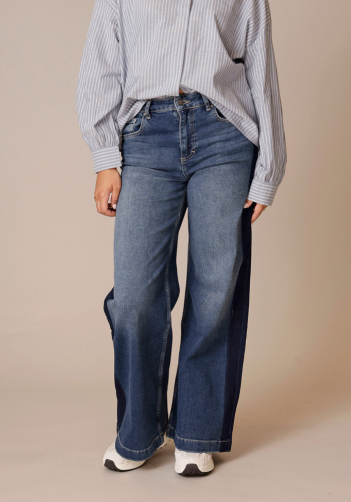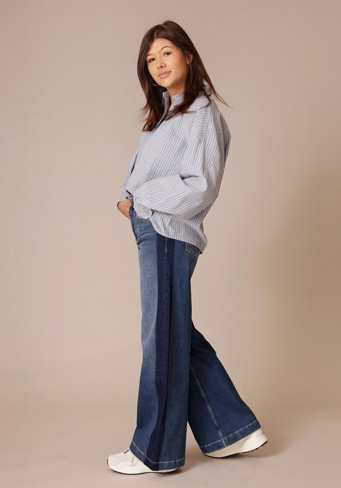 Deze jeans van Yaya heeft een wijde pijp en hoge taille. De broek heeft een knoop -en ritssluiting.