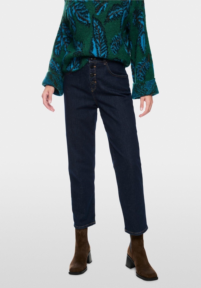 De jeans ROHA combineert een relaxte pasvorm en normale taillehoogte met een moderne sigarettenvorm, unieke wassing en contrasterende stiksels. Vijf zakken, een multiple-knopen sluiting en decoratieve sierknoop maken het ontwerp stijlvol, met het duurzame 'Rethink Together'-label.