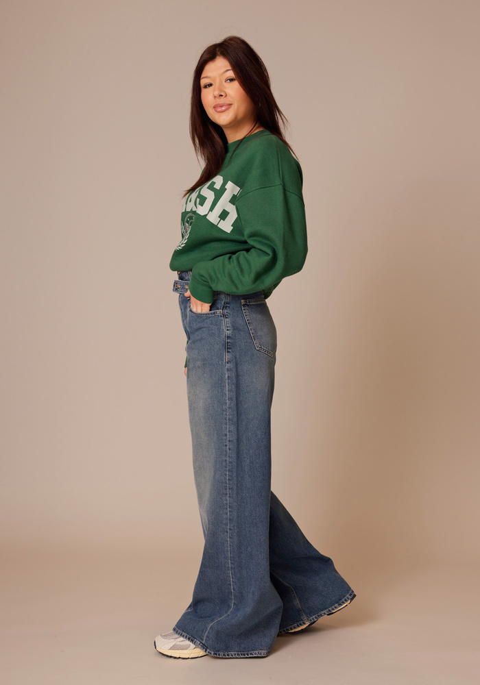 De Zoya-X-jeans van Mother kenmerkt zich door een wijde silhouet met een lage kruis en lange pijpen. De jeans is gemaakt van authentiek denim met een door de jaren 80 geïnspireerd salt-and-pepper-effect. De X-pockets, dubbele riemlussen en de geïntegreerde riem behoren tot de bijzondere designdetails.