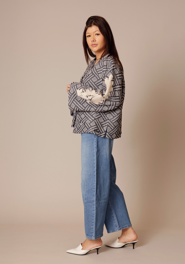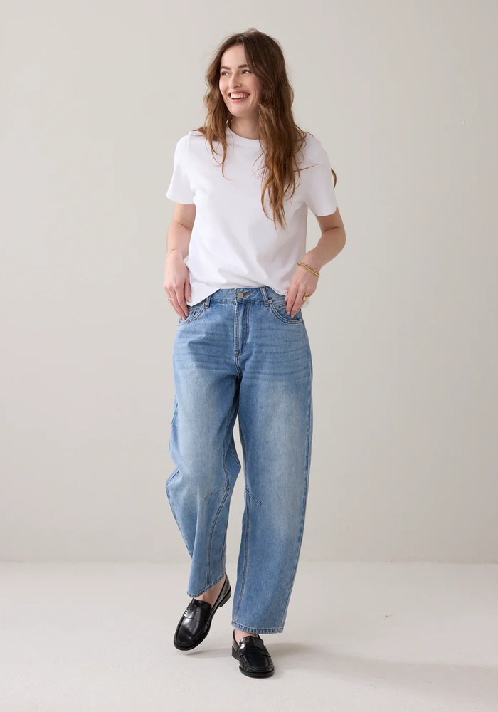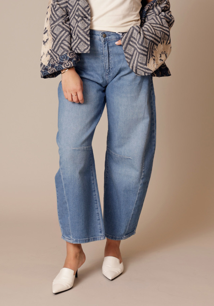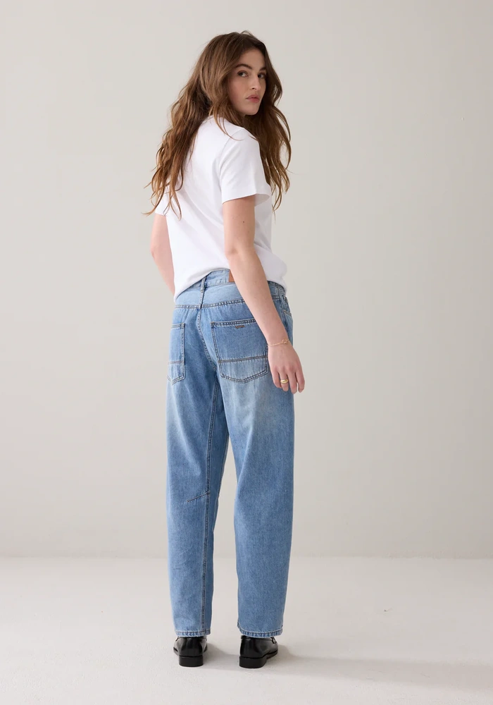 De Cocoon jeans van Summum is een lichtblauwe jeans met een barrel-fit. De jeans valt hoger in de taille en heeft een knoop -en ritssluiting.