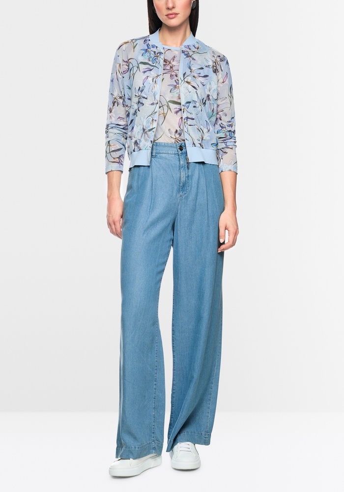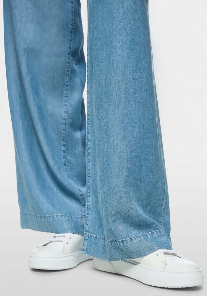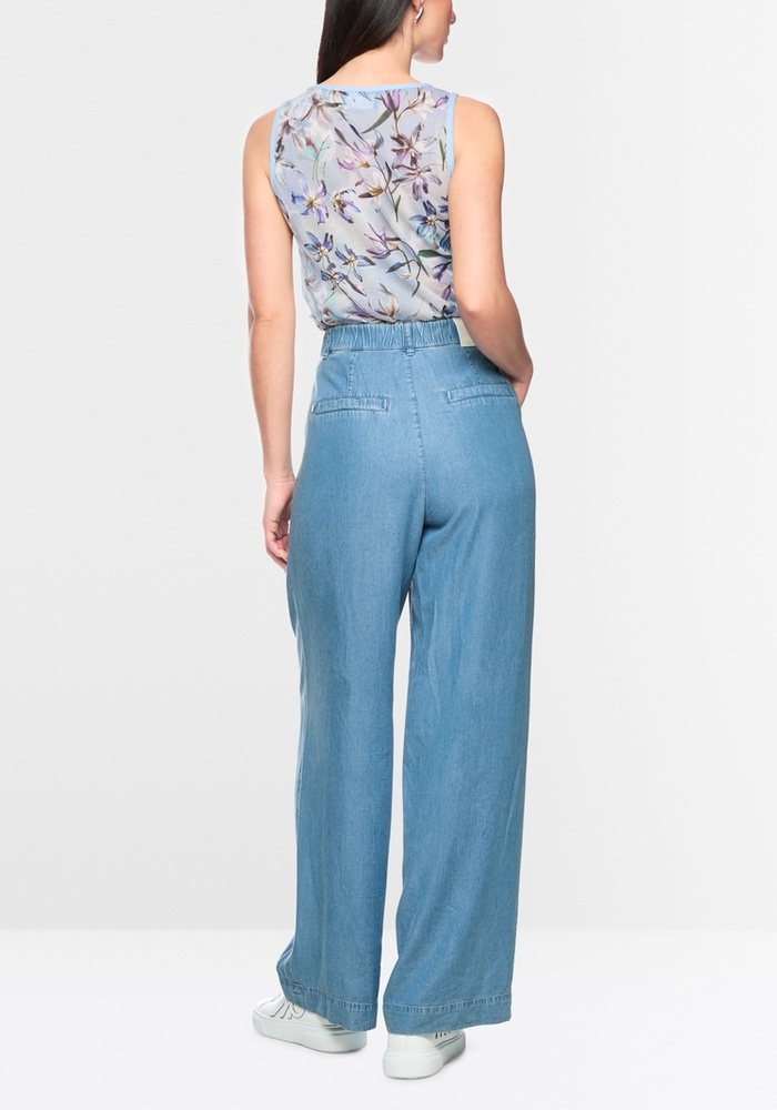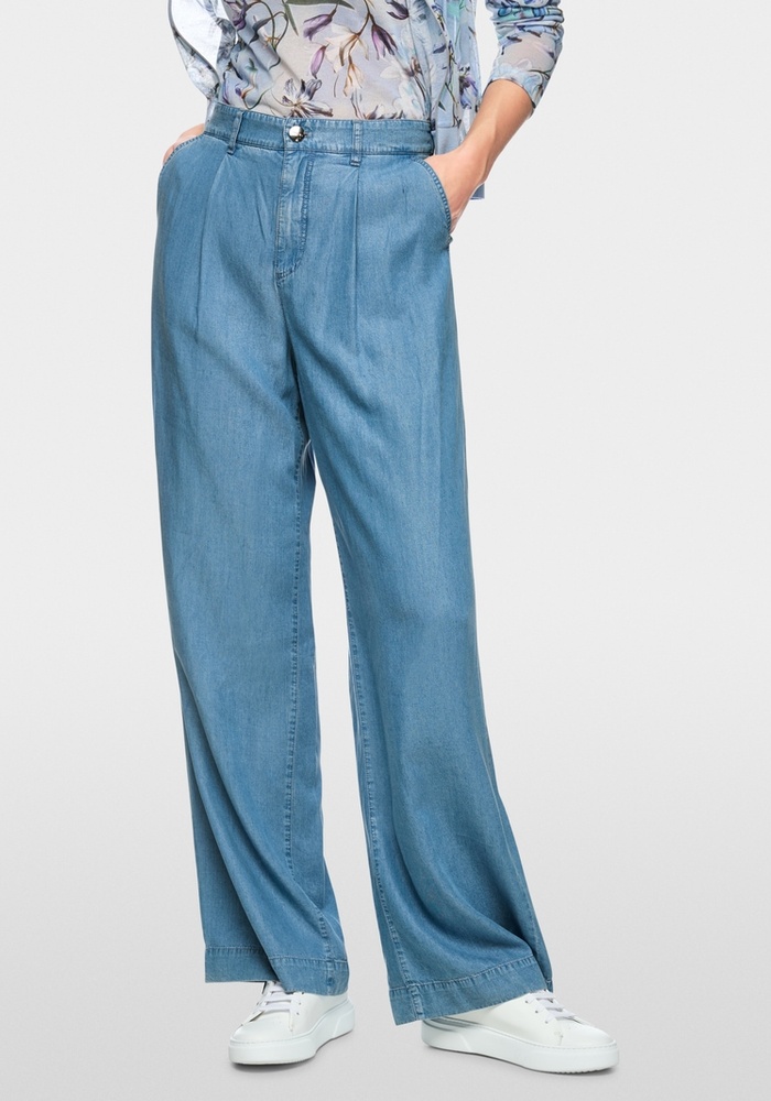 Marccain Wichita denimbroek heeft een losse pasvorm met hoge taille en lange pijpen. Gemaakt van duurzaam lyocell met bandplooien, steekzakken en een elastische tailleband voor een comfortabele en casual zomerse look.