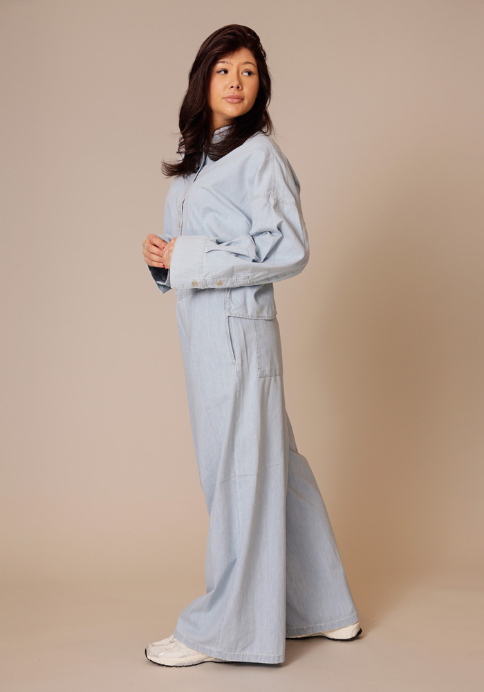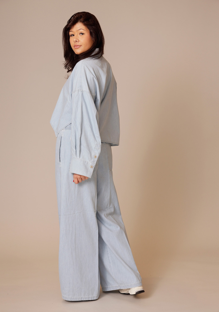De ceiling broek heeft een wijde, casual pasvorm met een elastische tailleband en wordt laag op de heup gedragen. De zacht glanzende modal zorgt voor een soepele valling en een comfortabel gevoel.