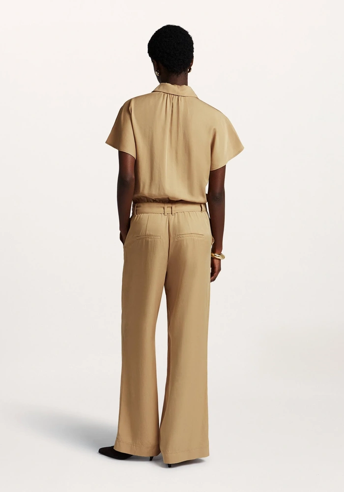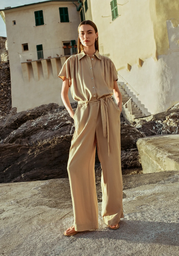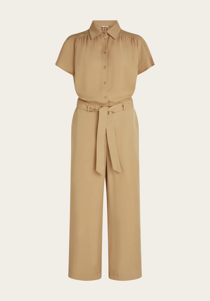 De Favory jumpsuit van Beaumont is gemaakt van soepel vallend Tencel en heeft een bijpassende riem van dezelfde stof voor een flatterende taille. De jumpsuit heeft korte mouwen en wijde pijpen, wat zorgt voor een stijlvolle, comfortabele pasvorm.