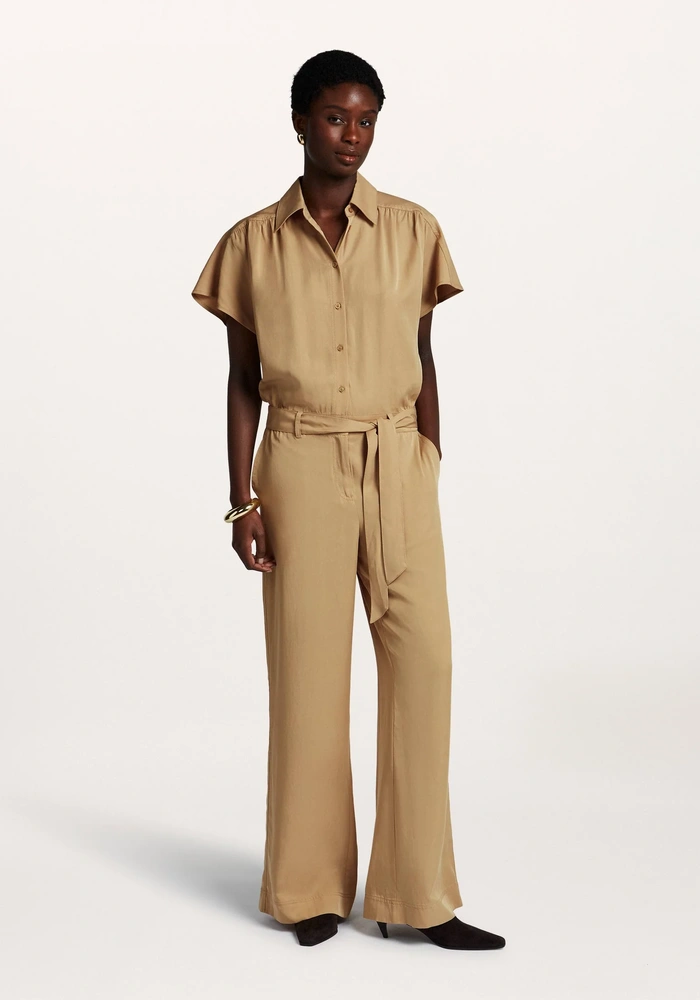 De Favory jumpsuit van Beaumont is gemaakt van soepel vallend Tencel en heeft een bijpassende riem van dezelfde stof voor een flatterende taille. De jumpsuit heeft korte mouwen en wijde pijpen, wat zorgt voor een stijlvolle, comfortabele pasvorm.
