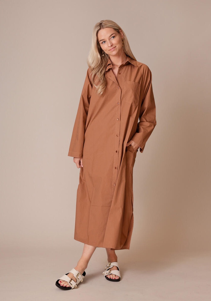 De Maddy dress van Bardou is een lange 100% katoenen jurk met splitjes aan de zijkant. De jurk is helemaal door geknoopt en heeft een klassieke kraag. De achterzijde heeft wat plooien waardoor de jurk mooi los valt. In 4 verschillende kleuren beschikbaar.