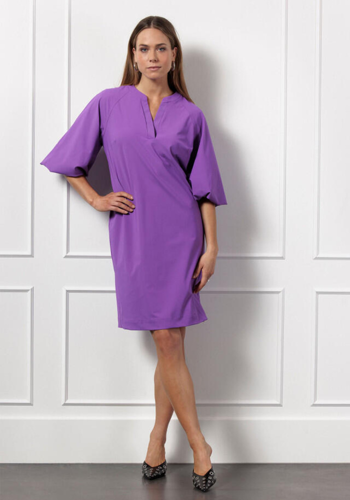 De Camilla dress van Studio Anneloes is een stijlvolle jurk met vrouwelijke flair. De combinatie van pofmouwen, een diepe v-hals en een elegante split maakt deze paarse jurk een opvallende verschijning.