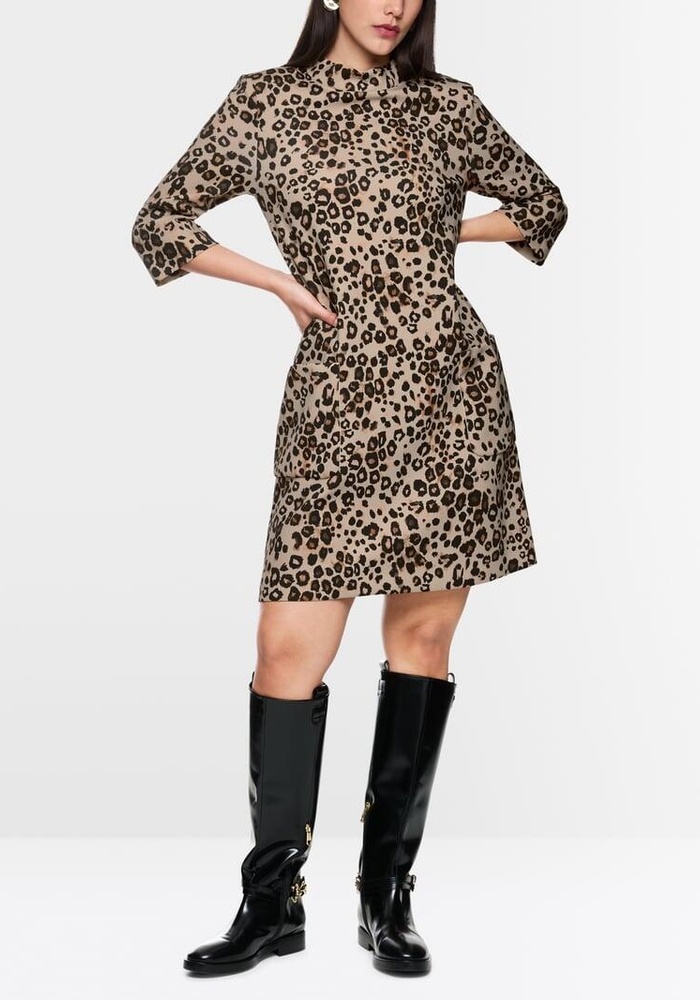 Deze jurk van Marccain is volledig bedrukt met een luipaardprint en heeft vrouwelijke accenten. De knielange snit loopt iets uit en heeft driekwartmouwen en schoudervullingen.