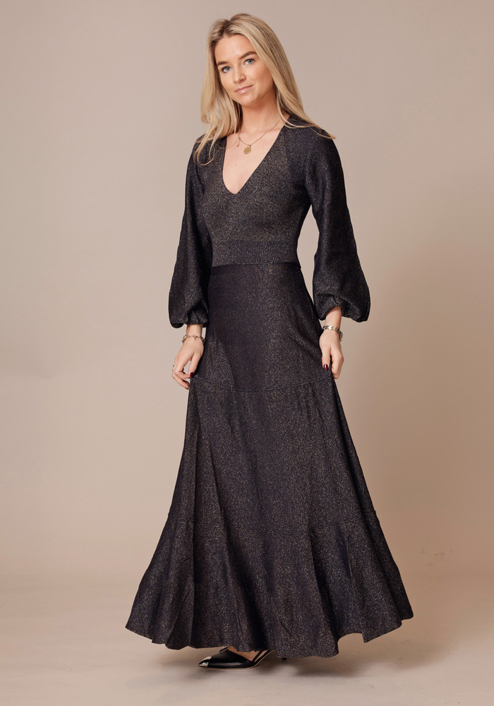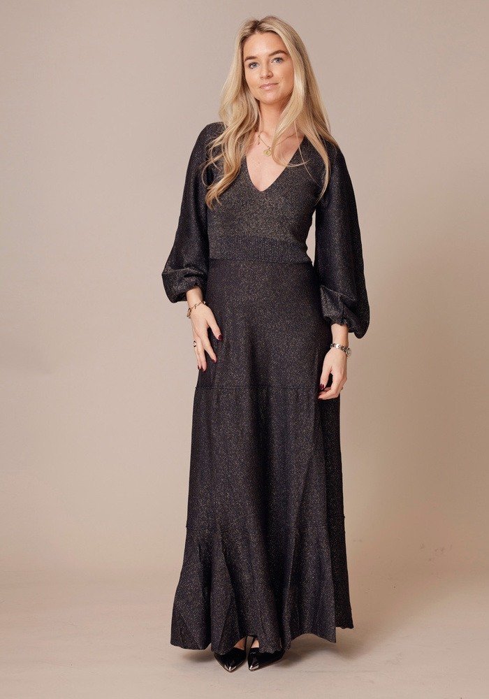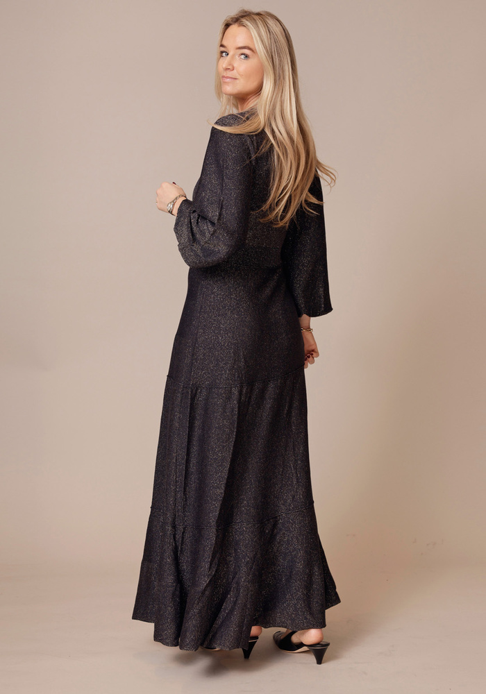 De Jenna dress van Ba&sh is een vrouwelijke maxi-jurk met een subtiele glitter. De jurk heeft een aangesloten pasvorm aan de bovenzijde en heeft lange mouwen.
