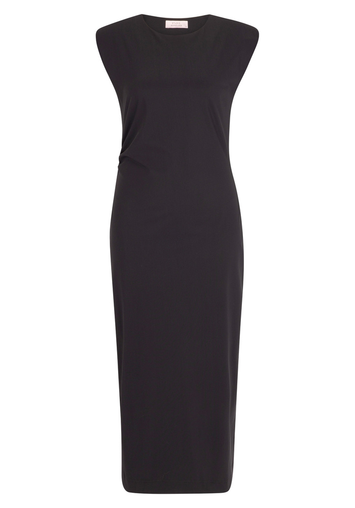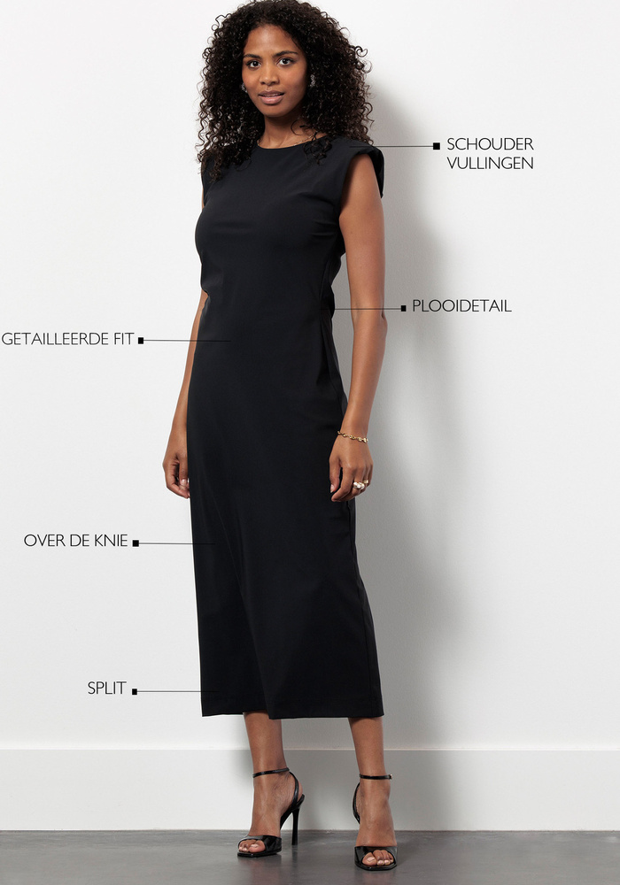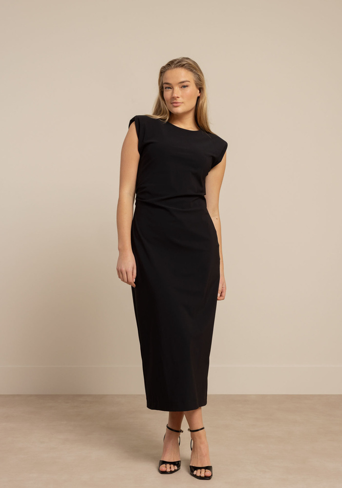 De Jewel dress van Studio Anneloes is een elegante essential met een krachtige, zelfverzekerde uitstraling. De zwarte tint vormt een tijdloze basis, terwijl verfijnde details zoals de schoudervullingen en de plooi in de taille het silhouet prachtig accentueren. De subtiele split aan de achterkant geeft het ontwerp een extra vleugje flair.