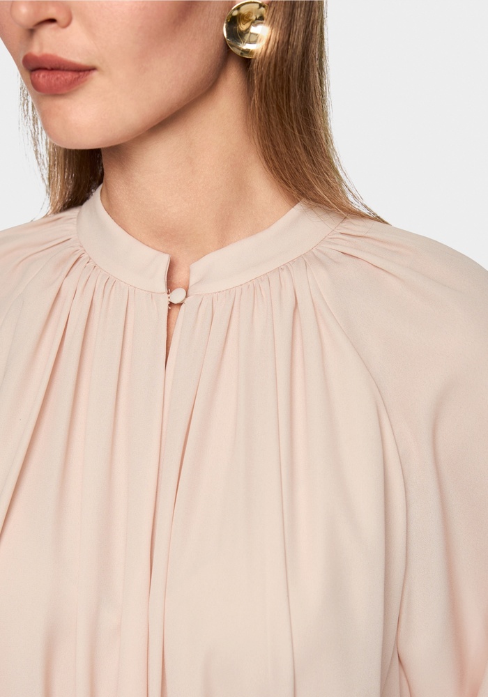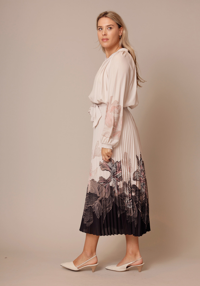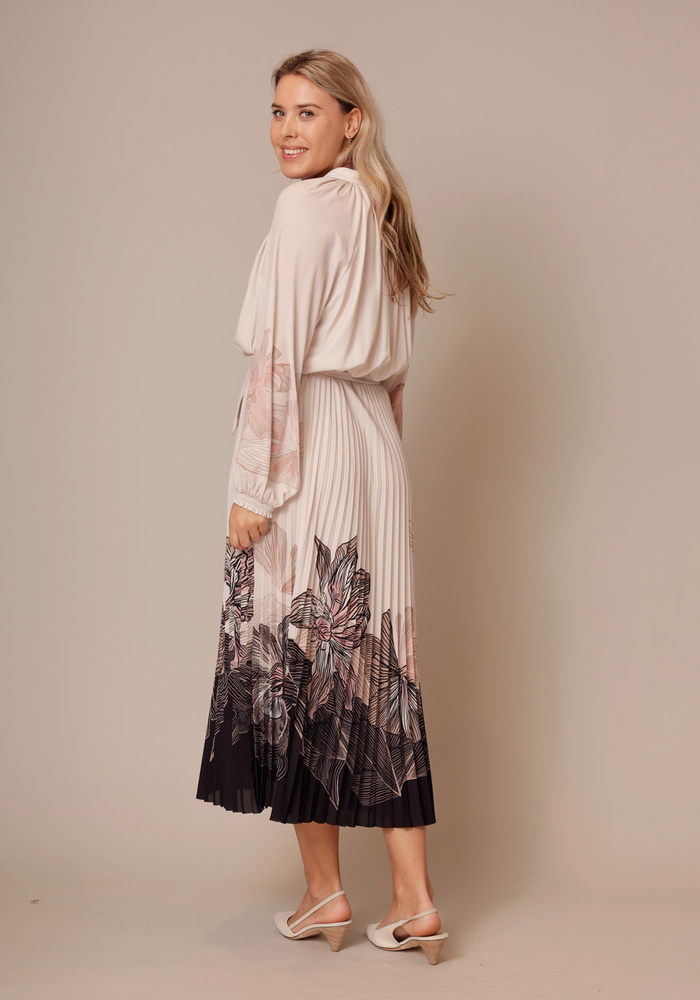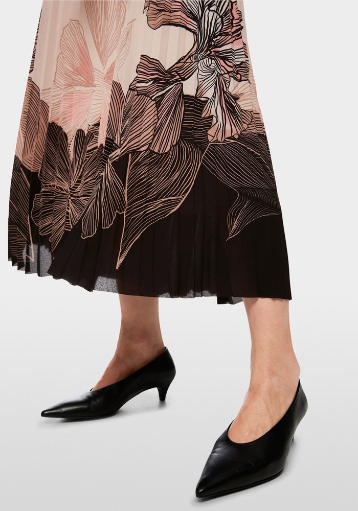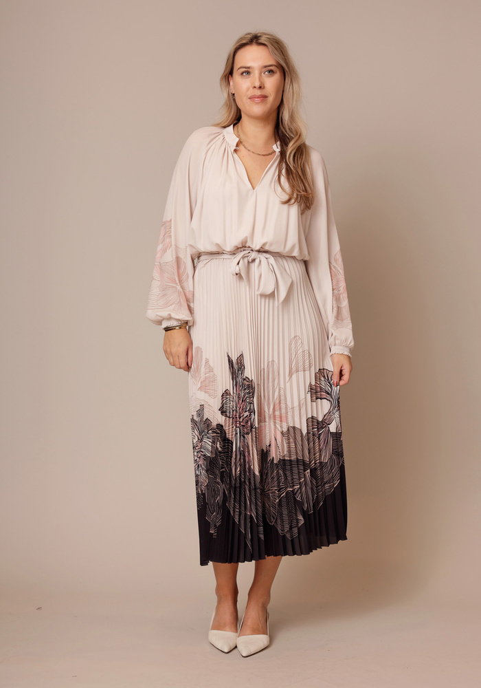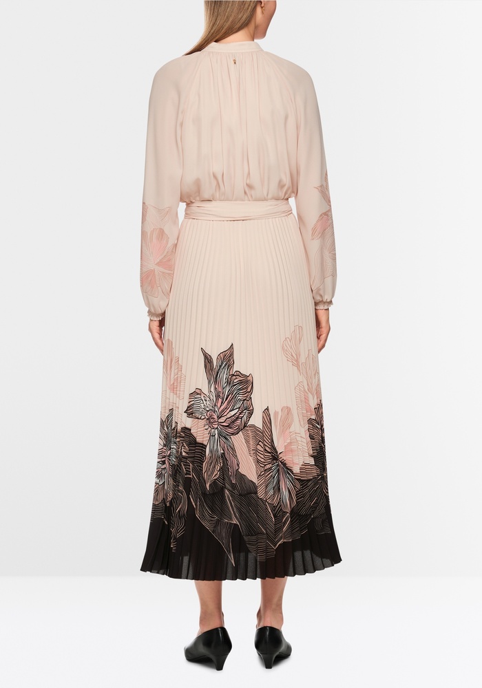 Vrouwelijke midi-jurk van Marccain met een combinatie van blouse en plissérok. Rok en mouwen hebben een fijne bloemenprint; de raglanmouwen eindigen in zachte boordjes. De opstaande kraag heeft een split en sluit met een knoop. Het strikceintuur accentueert de taille. Een mix van strakke lijnen, romantische details en verfijnde tailoring. Duurzaam met het “Rethink Together”-label.