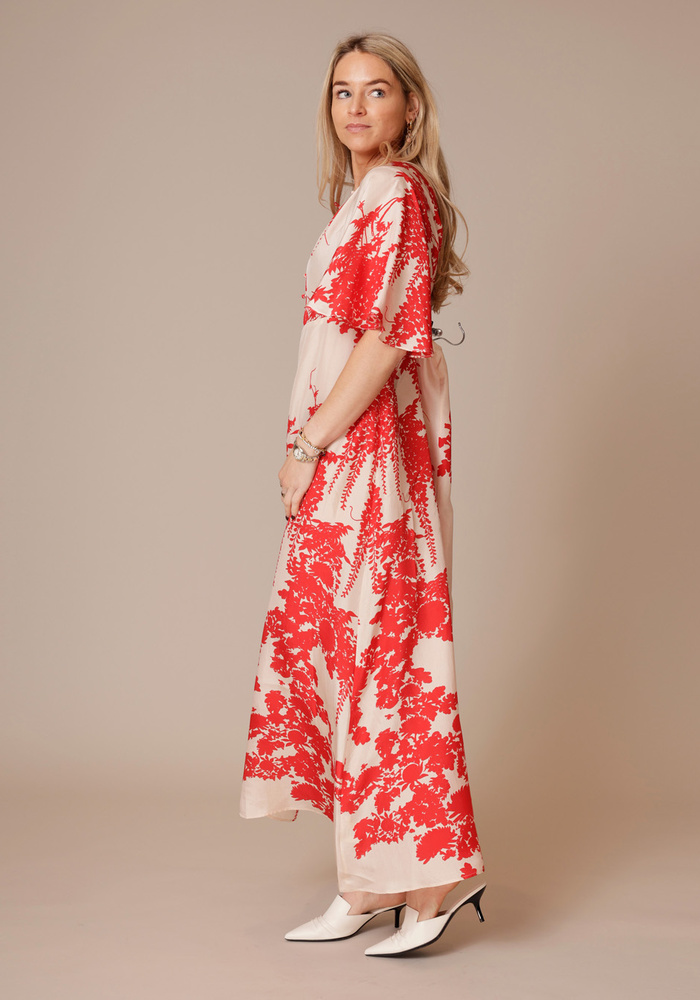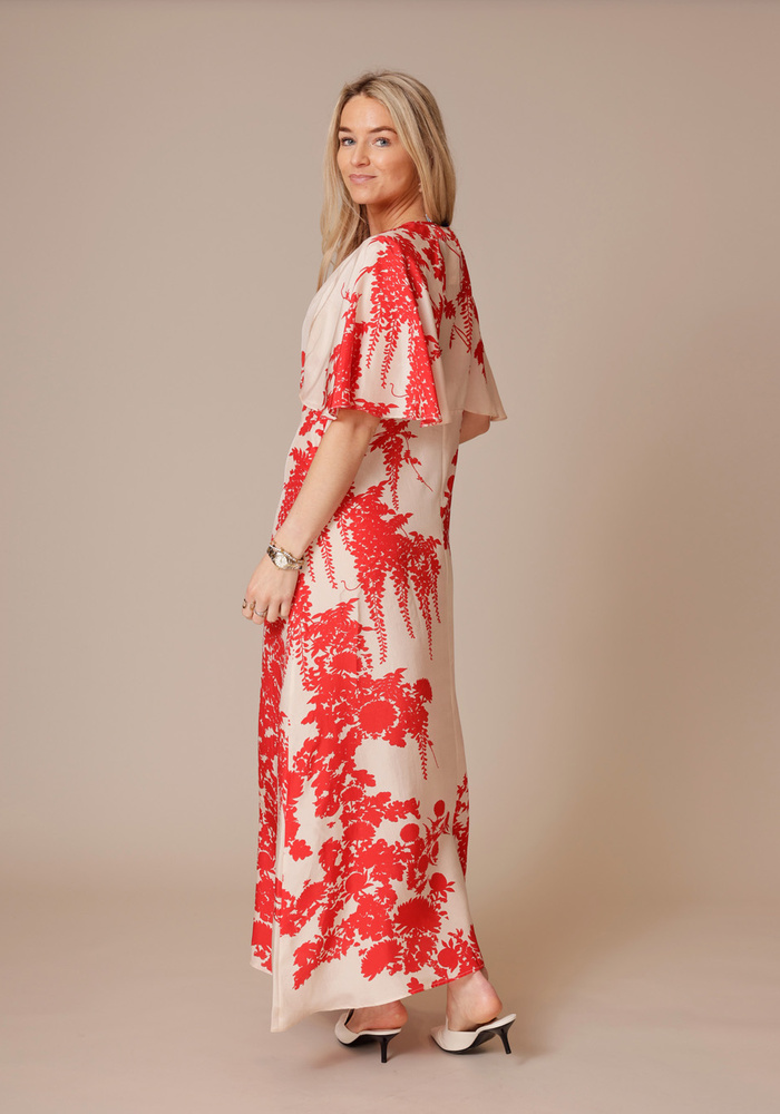 De Kanak dress van Ornate is een lange jurk die licht getailleerd is met korte vlinder pofmouwen.