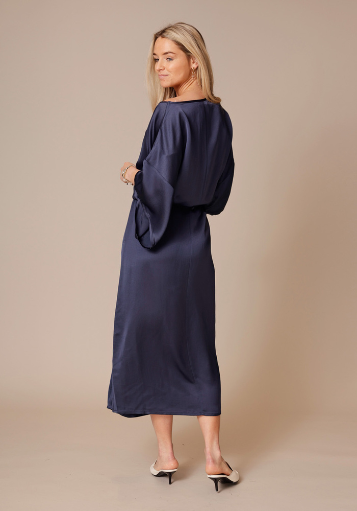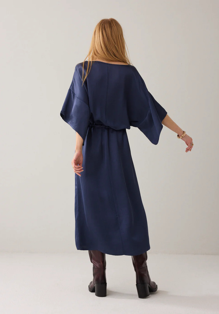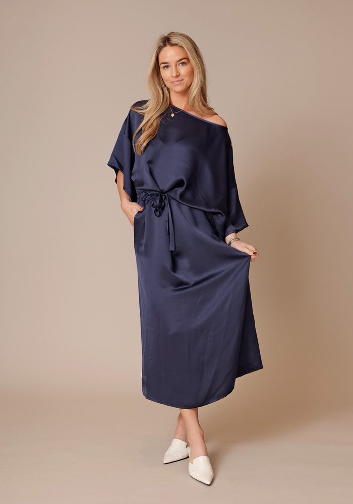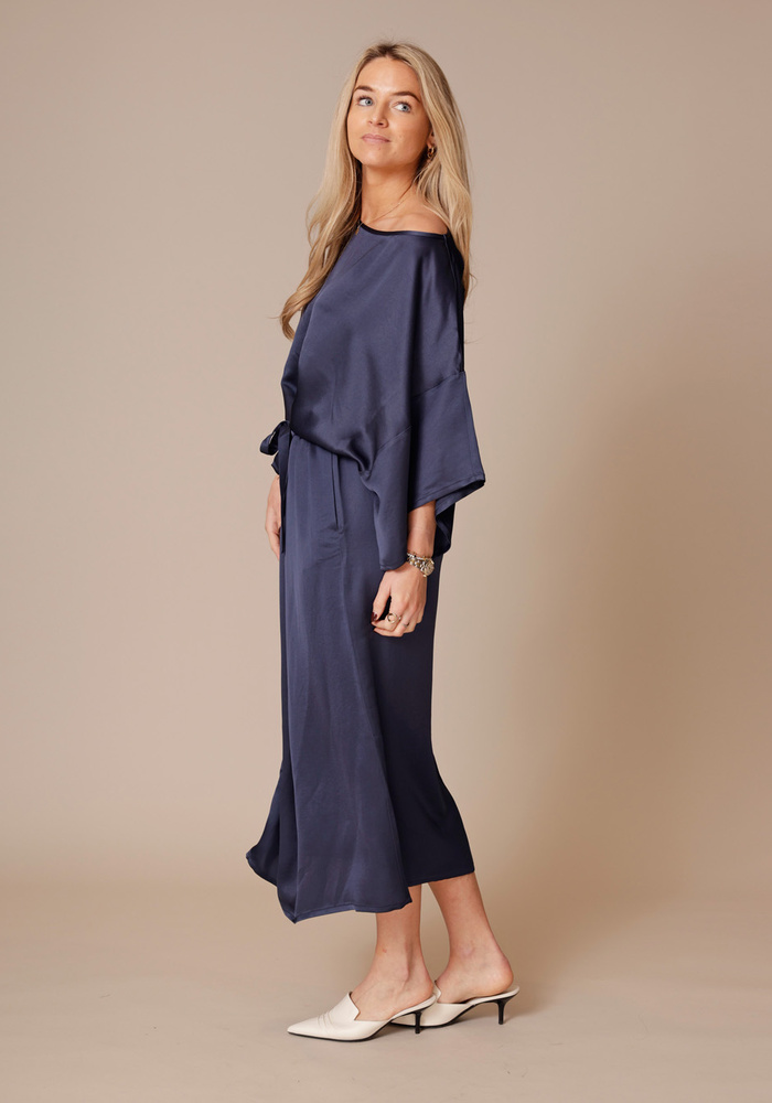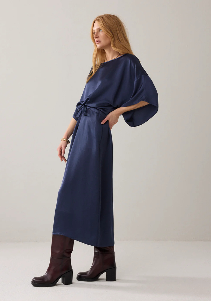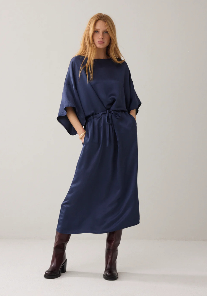 Deze silky dress van Summum met een subtiele glans. Het model heeft een boothals met afgewerkte rand, wijde rechte mouwen met verlaagde schoudernaad en een aangerimpelde taille met strikkoord in een tunnel.