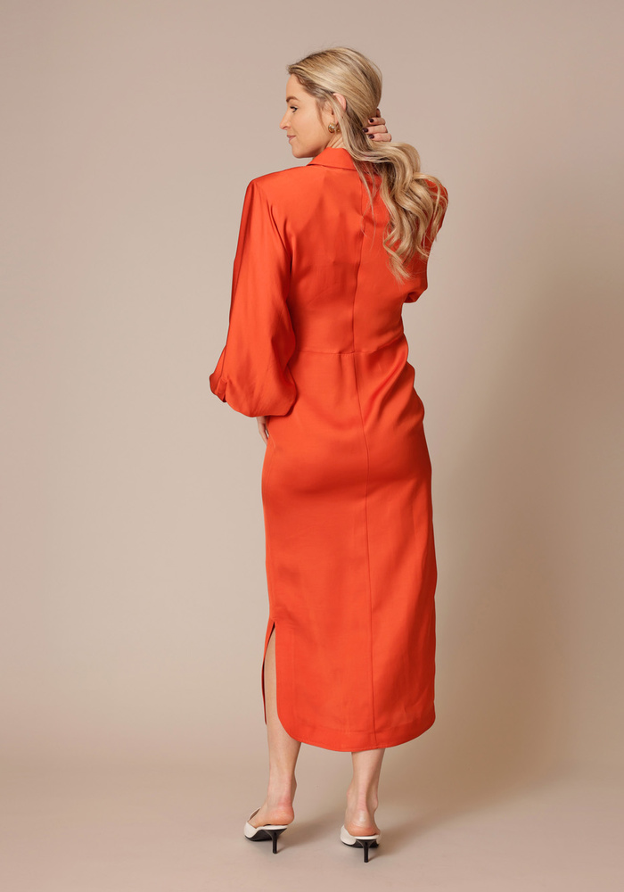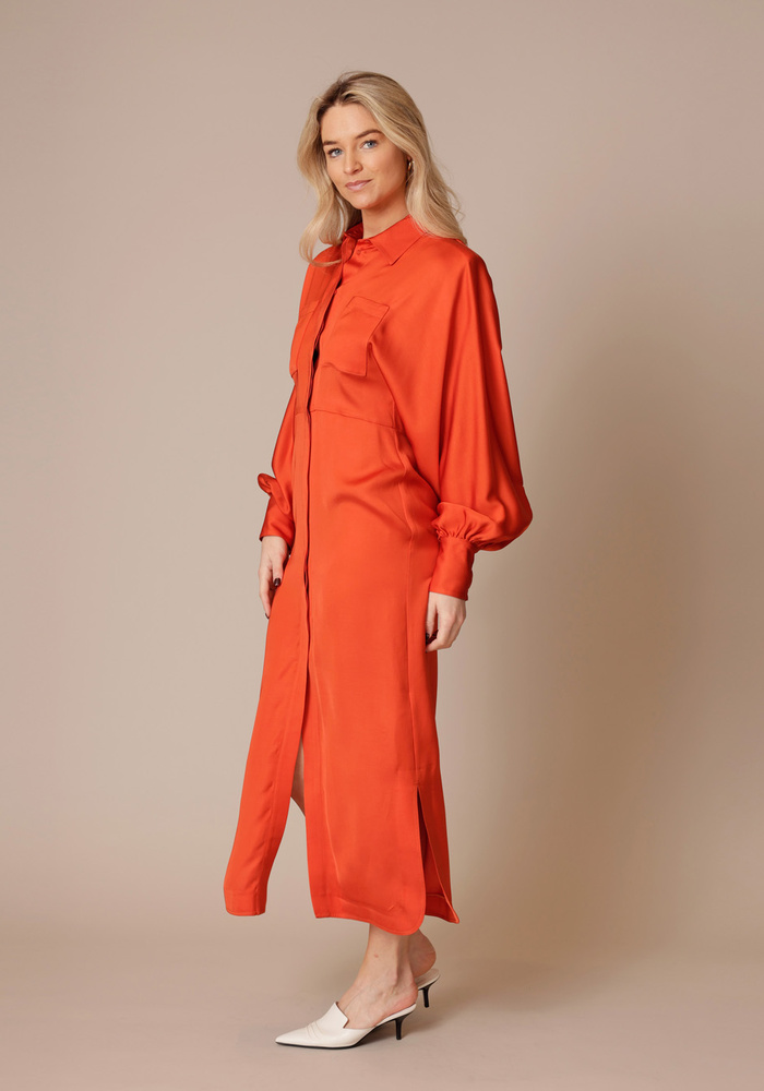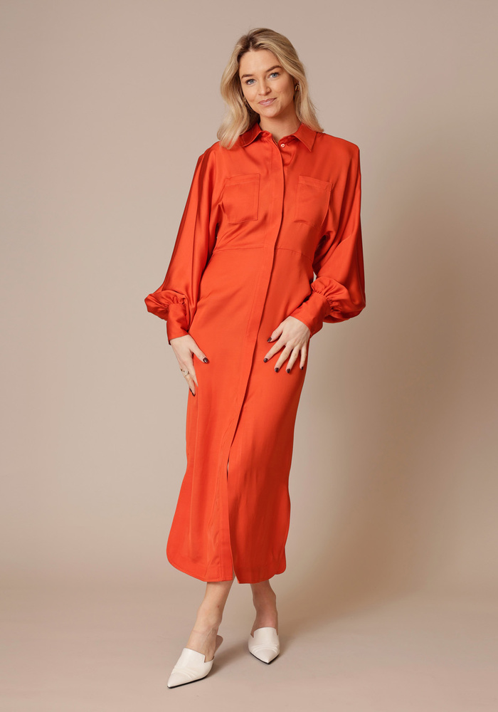 De IRO Ursana dress is een elegante midi-jurk met een verfijnde blousekraag, lange mouwen en een flatterend, recht silhouet. De soepele stof en knoopsluiting geven de jurk een moderne, vrouwelijke uitstraling die moeiteloos chic oogt. Perfect te dragen van dag tot avond, zowel casual met flats als stijlvol met hakken.
