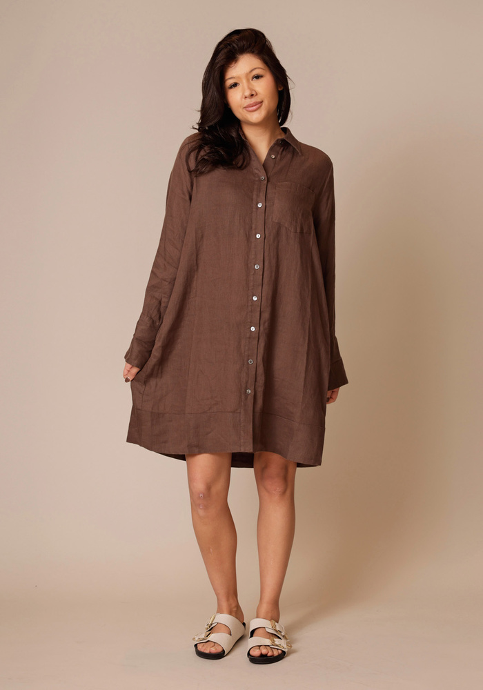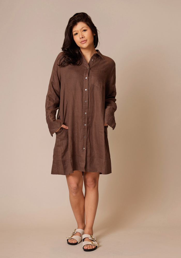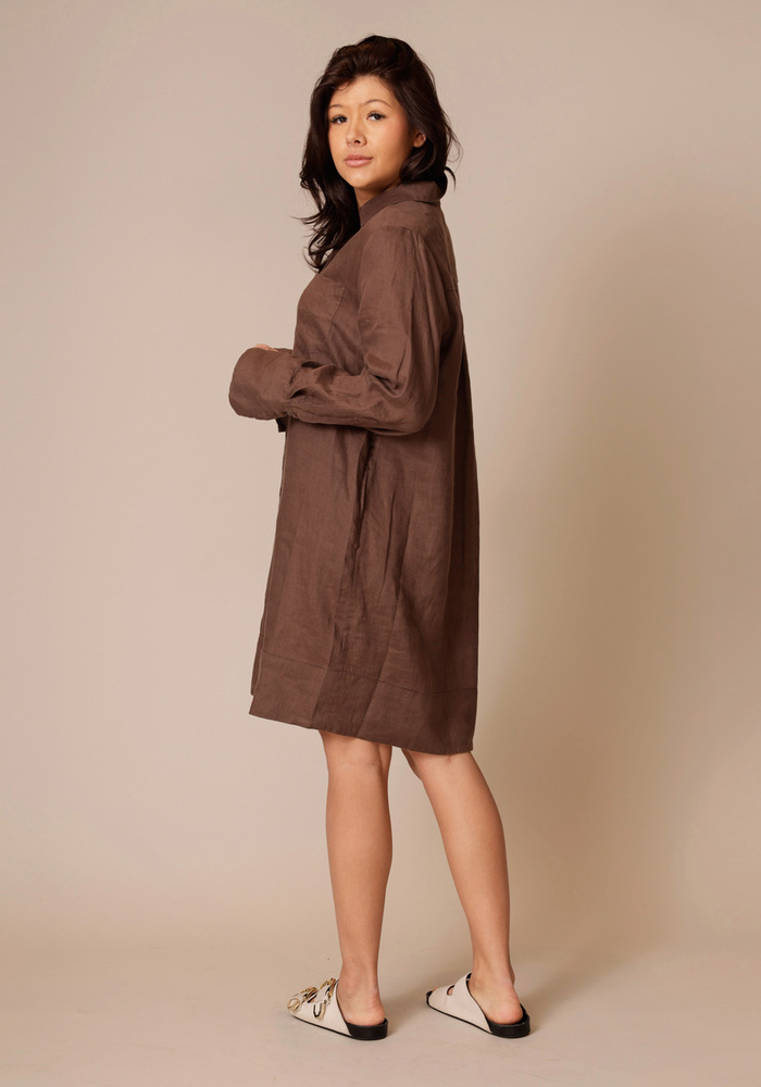 Deze jurk van Repeat is een linnen jurk met halflange lengte. De jurk heeft lange mouwen en een knoopsluiting aan de voorzijde.