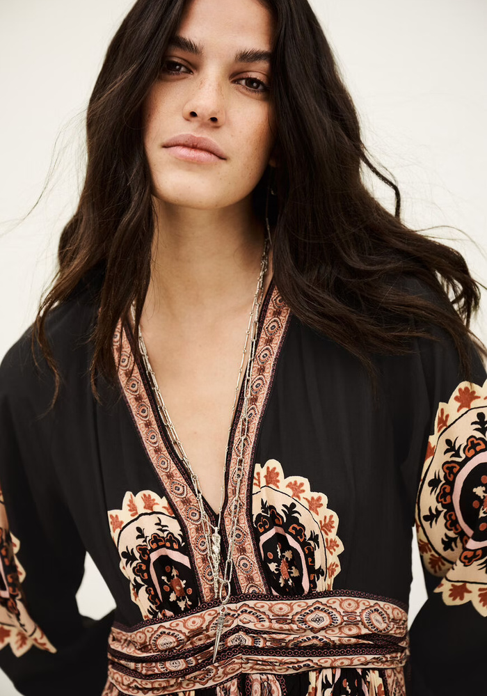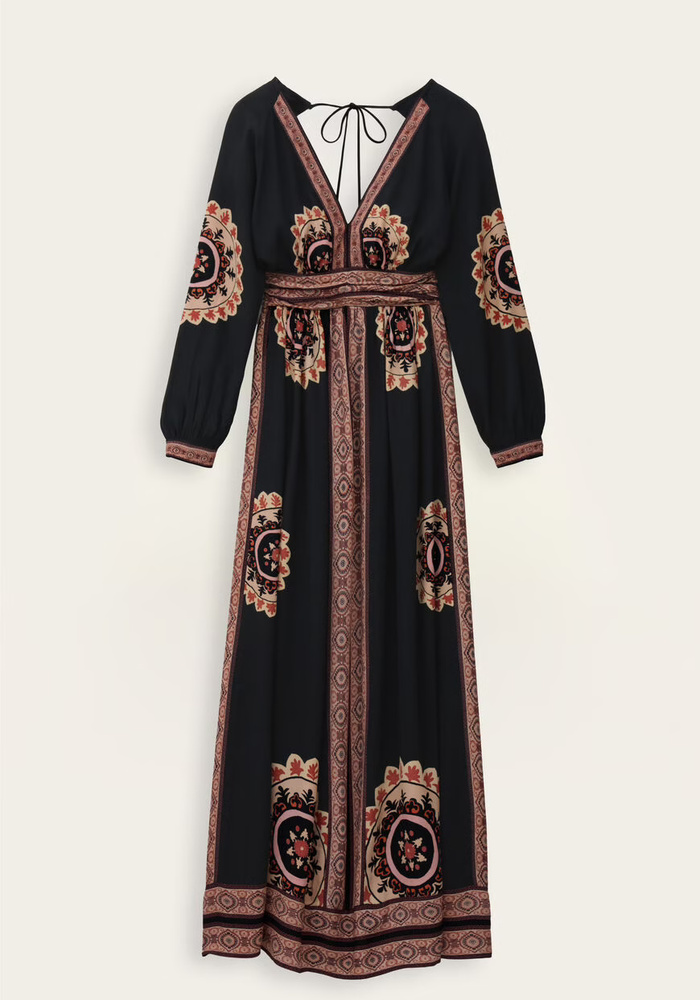 Maxi-jurk met print, ruches en rozetten, afgewerkt met een elegante V-hals. De open rug met strikjes en de soepele pasvorm geven een vrouwelijke en luchtige uitstraling.