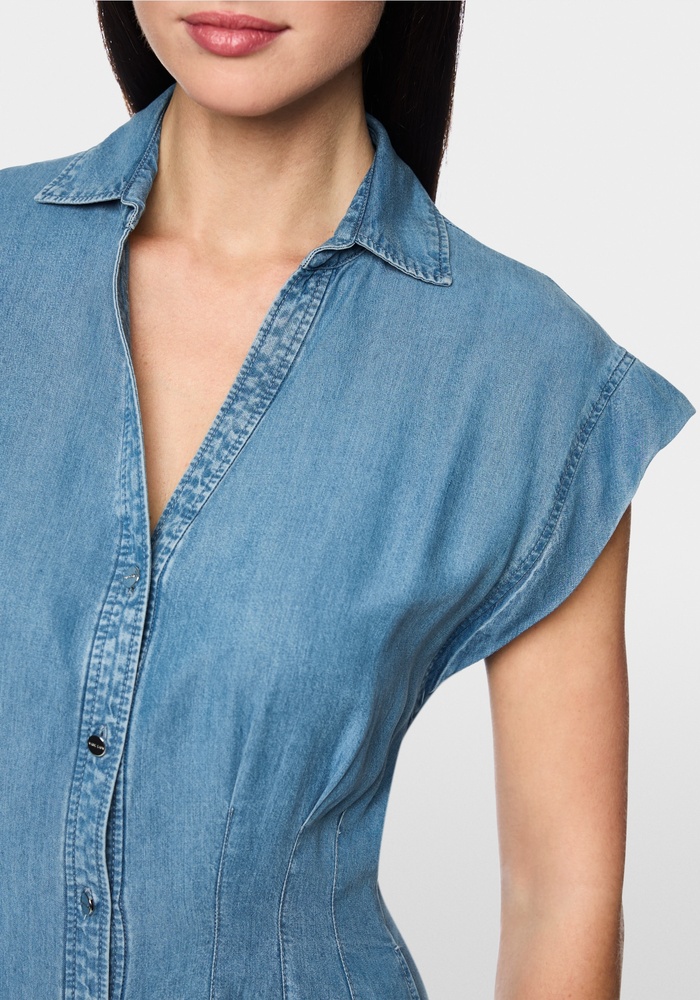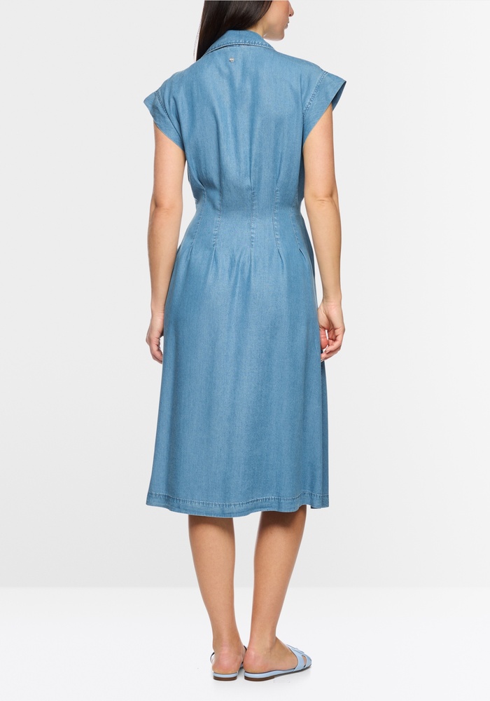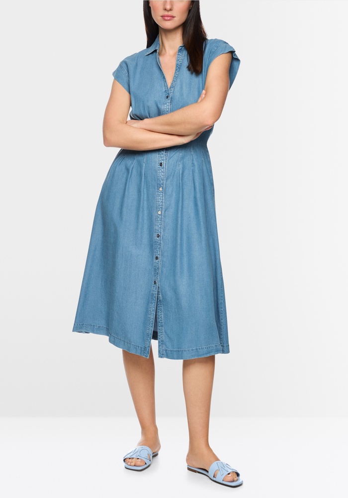 De elegante midi-jurk van Marccain is van hoogwaardige denimkwaliteit valt op door de kapmouwtjes en de klassieke kraag. De taille wordt geaccentueerd door de coupenaden en kleine plooitjes. De jurk is aan de voorkant doorlopend geknoopt. De iets uitlopende rok zorgt voor een vrouwelijk silhouet. De jurk is veelzijdig te combineren en overtuigt zowel in het dagelijks leven als bij speciale gelegenheden. De jurk draagt het duurzaamheidslabel “Rethink Together”.