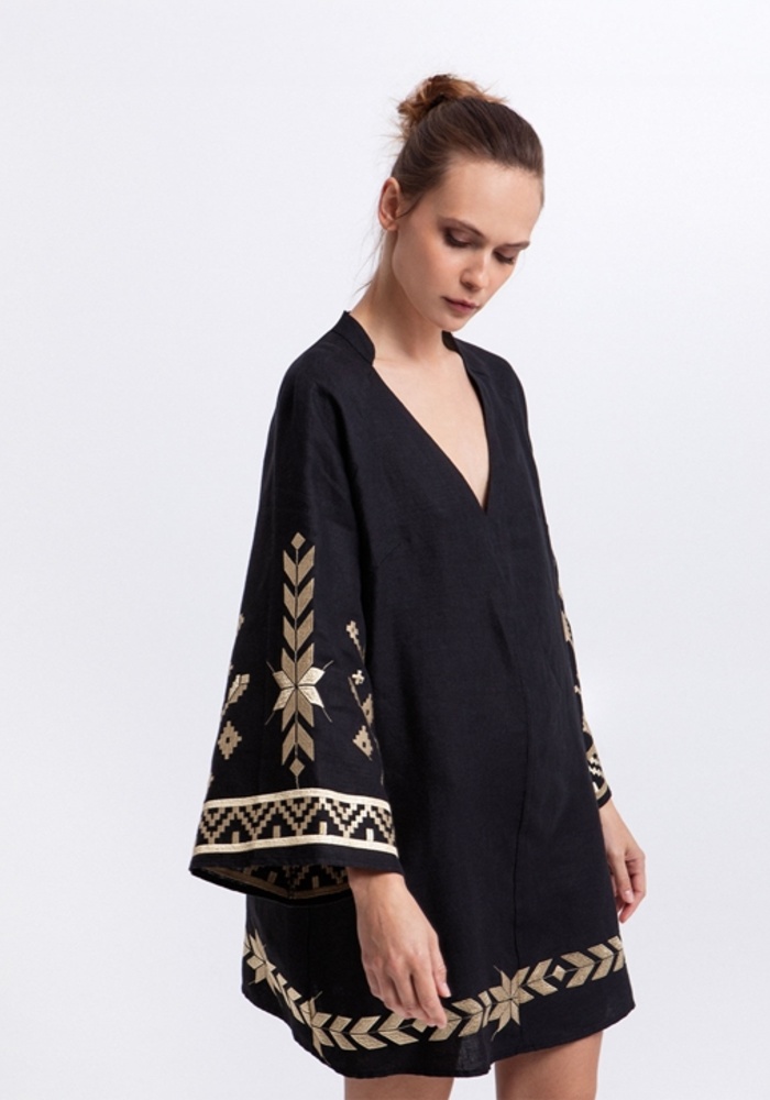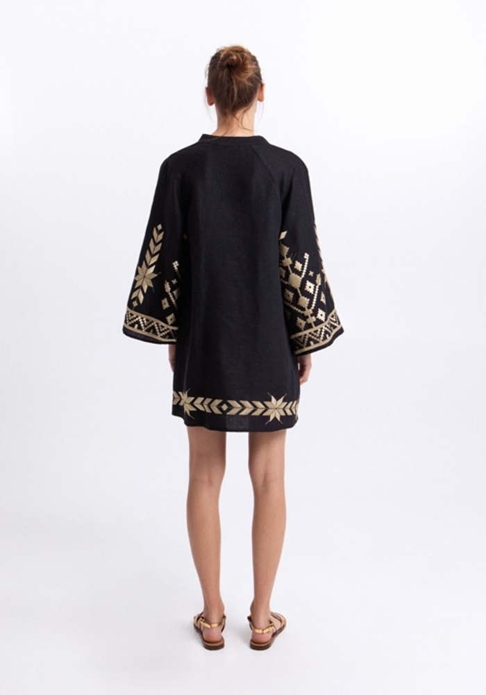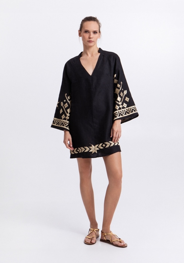 De Greek Archaic Kori Dress in Black Gold heeft een elegante oversized pasvorm met V-hals en brede mouwen. Subtiele borduursels geven de jurk een verfijnde, zomerse uitstraling.