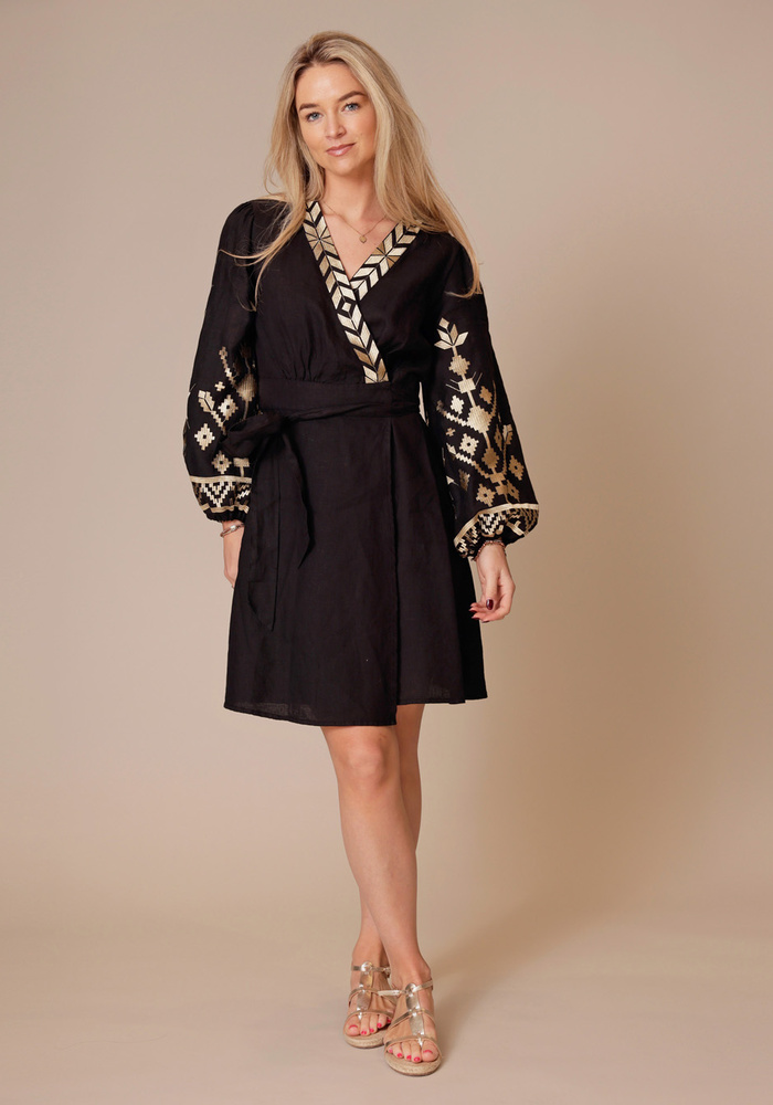 De Greek Archaic Kori Dress in Black Gold heeft een elegante oversized pasvorm met V-hals, ceintuur en brede mouwen. Subtiele borduursels geven de jurk een verfijnde, zomerse uitstraling.