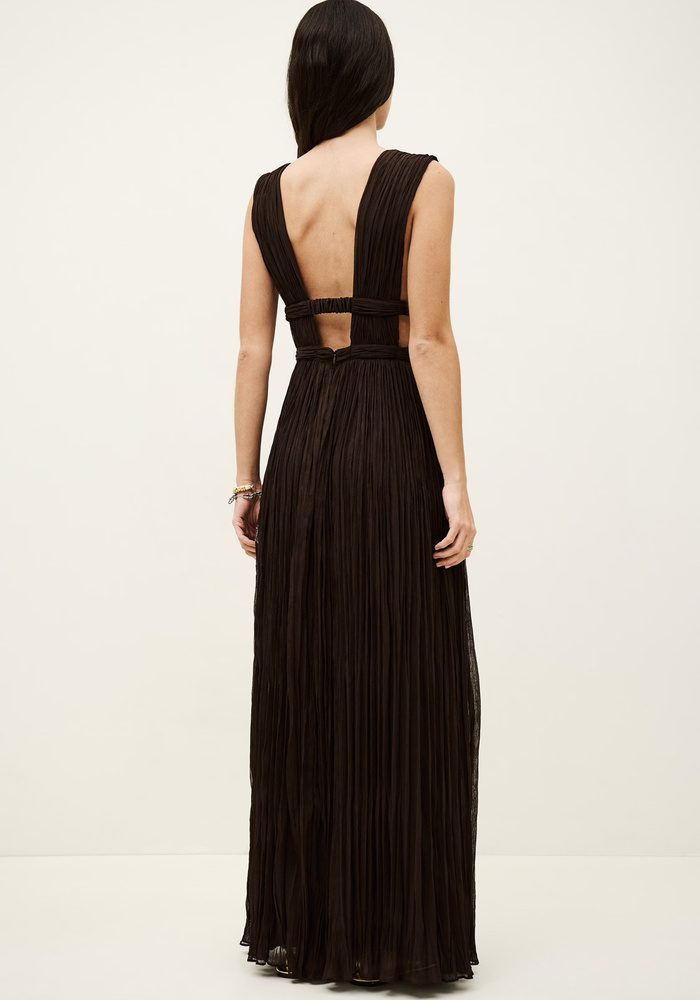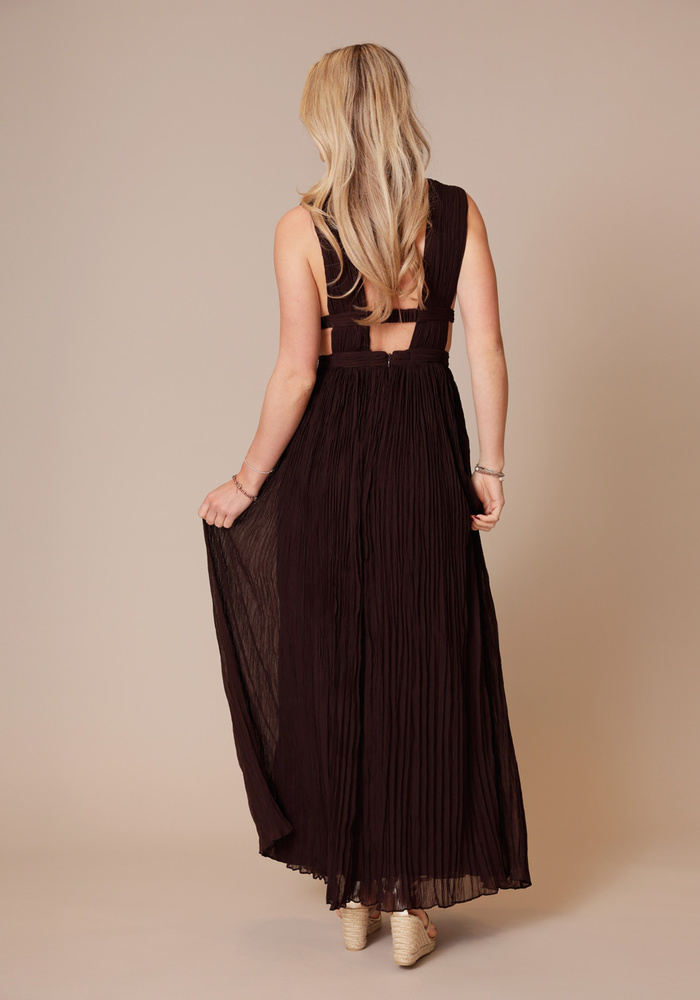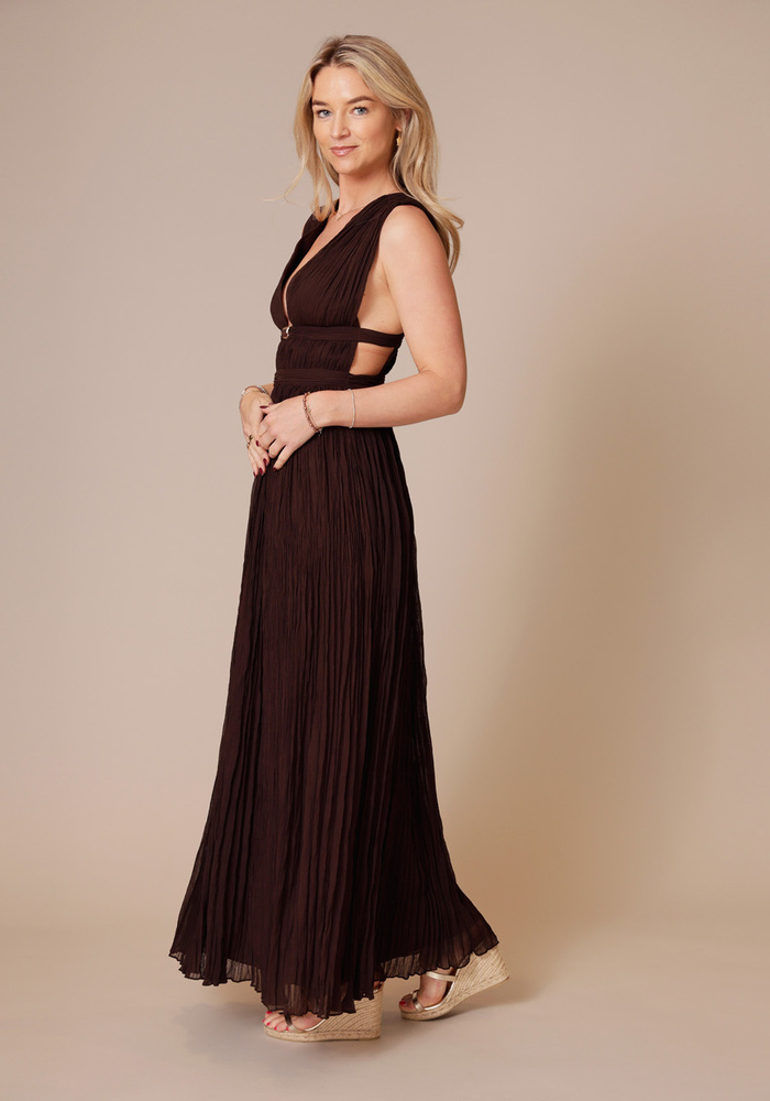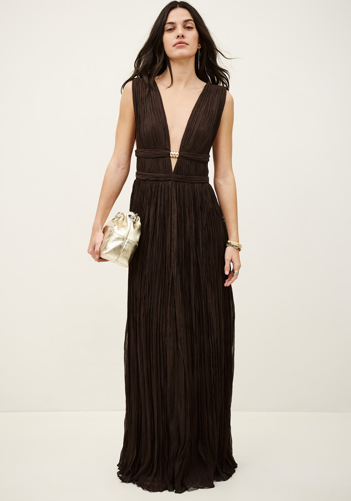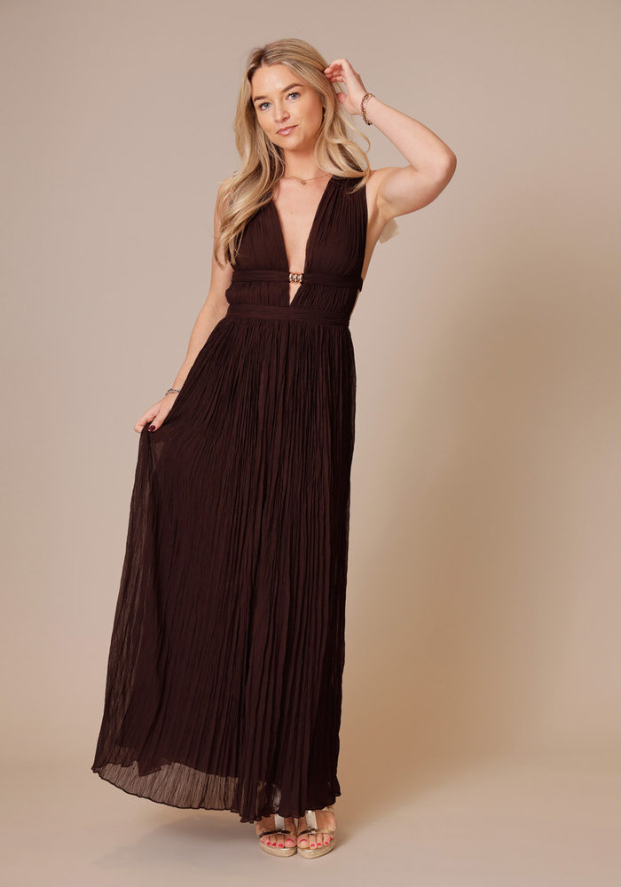 Deze lange jurk heeft een elegante V-hals en een mooi op maat gesneden pasvorm die het silhouet prachtig volgt. De jurk is afgewerkt met metalen sierdetails en sluit aan de zijkant met een onzichtbare rits voor een verfijnde uitstraling.