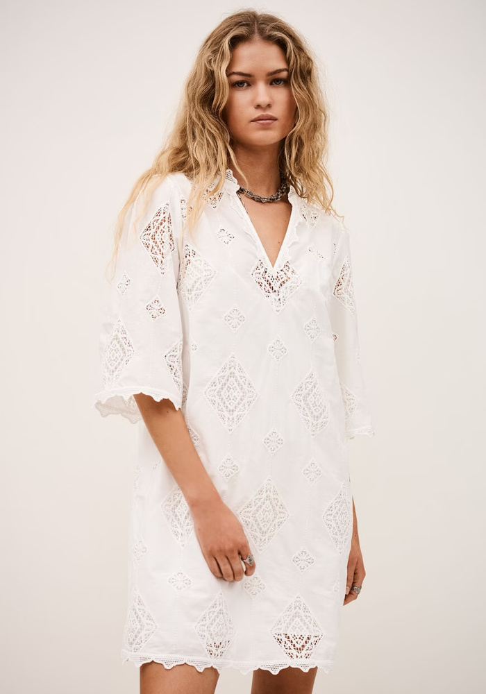 Dit jurkje heeft een kort model en is afgewerkt met fijn Engels borduurwerk en elegante, uitlopende mouwen tot aan de elleboog. De ronde hals met V-vormige split, gegolfde randen en de zachte voering zorgen voor een vrouwelijke en comfortabele uitstraling.