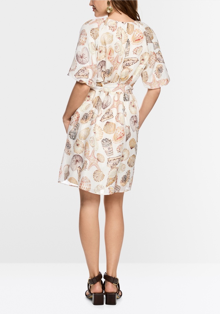 Luchtige mini-jurk van Marccain van linnen-zijdemix met zomerse schelpenprint. V-hals met sierknoop en strikceintuur voor een vrouwelijk accent. Uitlopende pasvorm, wijde mouwen en viscose voering voor comfortabel, soepel dragen.