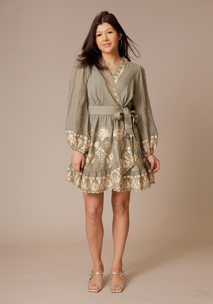 Deze jurk van Greek Archaic Kori is een prachtige jurk met gouden details. De jurk heeft lange mouwen en een overslag.