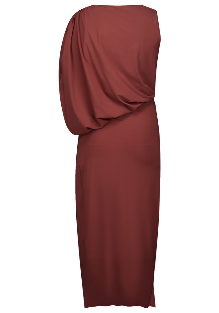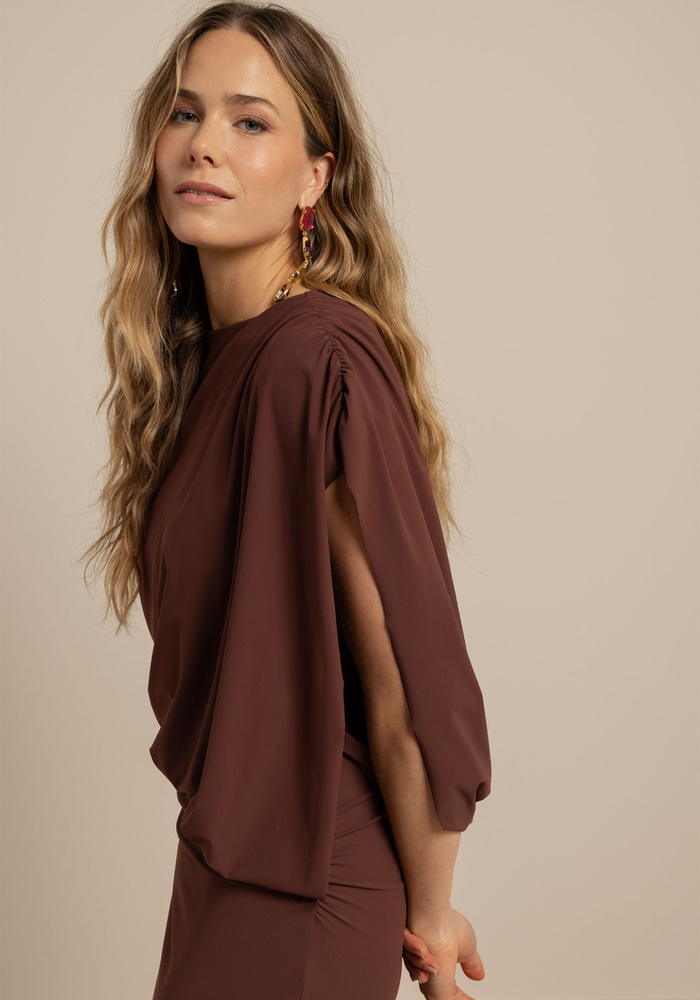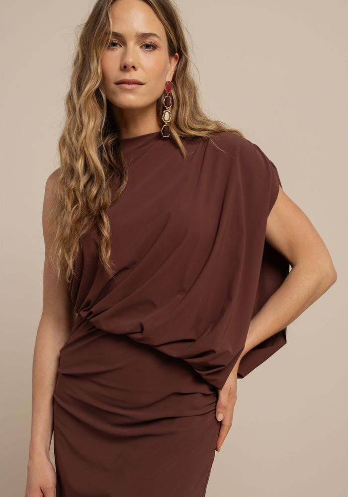 De Lynn dress van Studio Anneloes is een elegante maxi jurk in Chestnut, met one-shoulder en gedrapeerde mouw voor een verfijnde look. Gemaakt van comfortabele, stretch- en kreukvrije travelstof, perfect voor bruiloften of andere speciale gelegenheden.