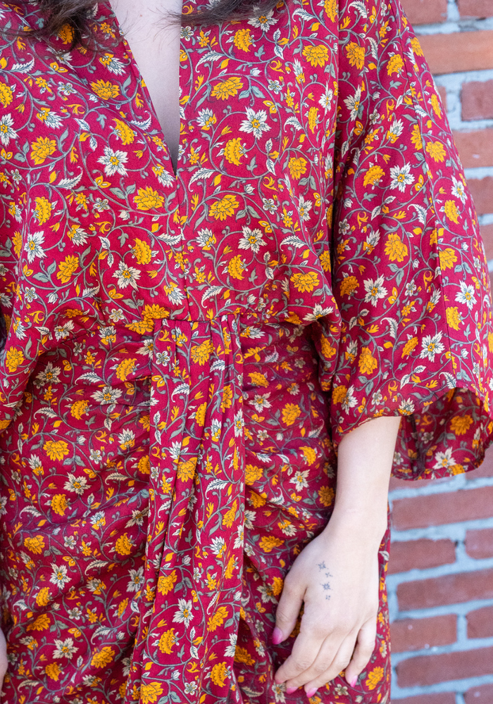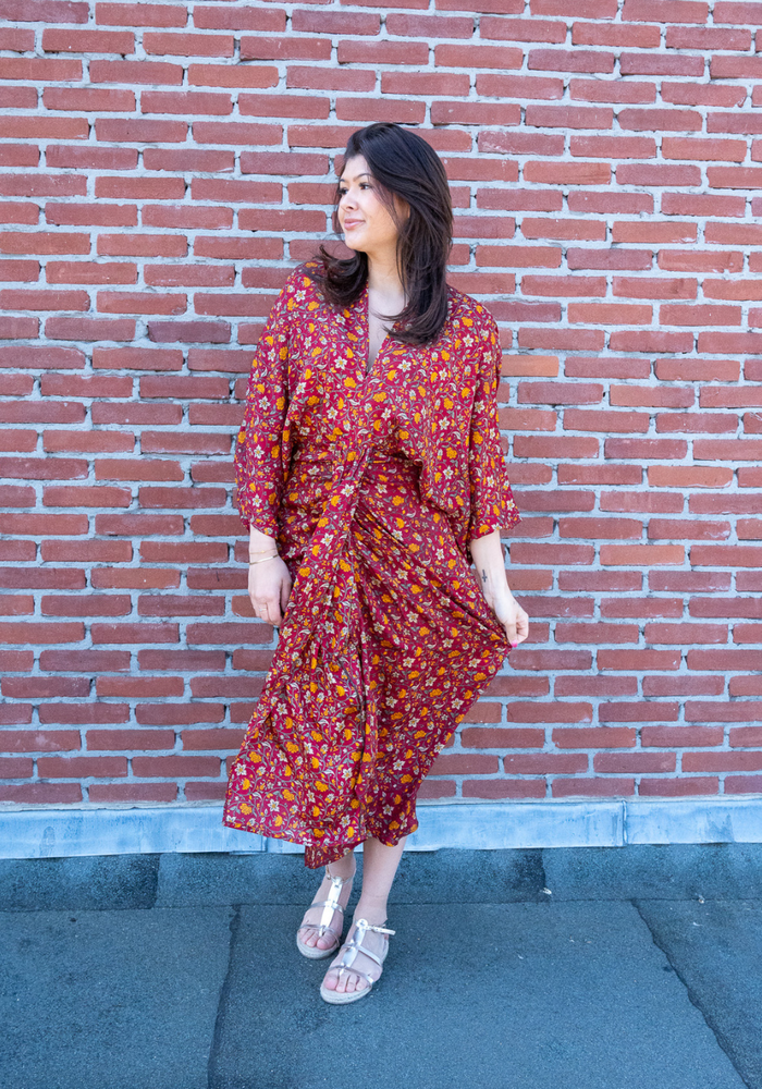 De Juno dress van Sissel Edelbo is een unieke en duurzame damesjurk met een bohemian uitstraling, waarbij elke jurk volledig one-of-a-kind is. De jurken worden gemaakt van gerecyclede, oude sari’s uit India, waardoor elk item een eigen verhaal, kleurencombinatie en karakter heeft.