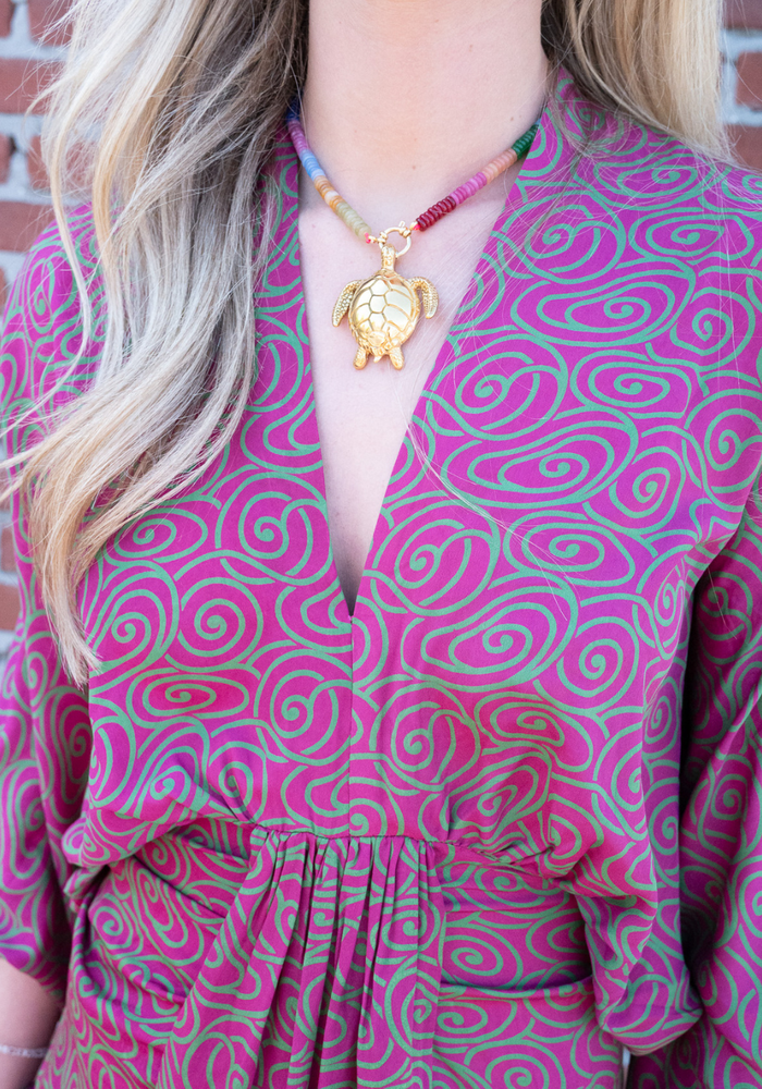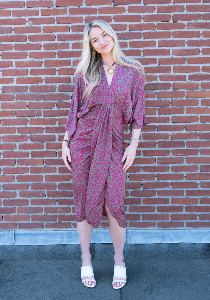 De Juno dress van Sissel Edelbo is een unieke en duurzame damesjurk met een bohemian uitstraling, waarbij elke jurk volledig one-of-a-kind is. De jurken worden gemaakt van gerecyclede, oude sari’s uit India, waardoor elk item een eigen verhaal, kleurencombinatie en karakter heeft.