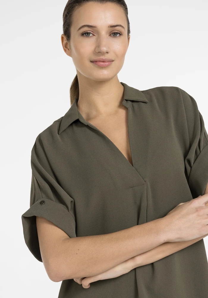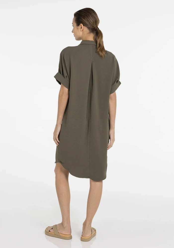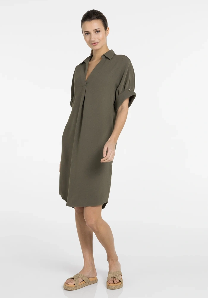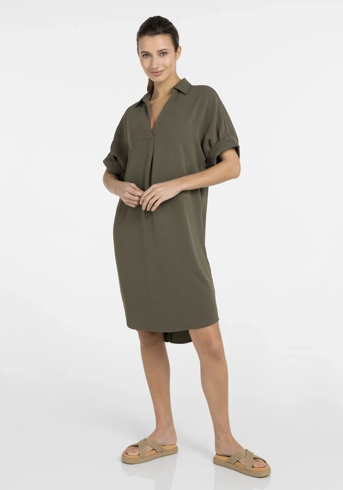 Deze jurk van Yaya heeft een V-hals, korte mouwen met subtiele geplooide details en een losse pasvorm. Het ontwerp valt langer, waardoor een comfortabel en flatterend silhouet ontstaat. De strakke afwerking en zachte drapering geven de jurk een verfijnde uitstraling.
