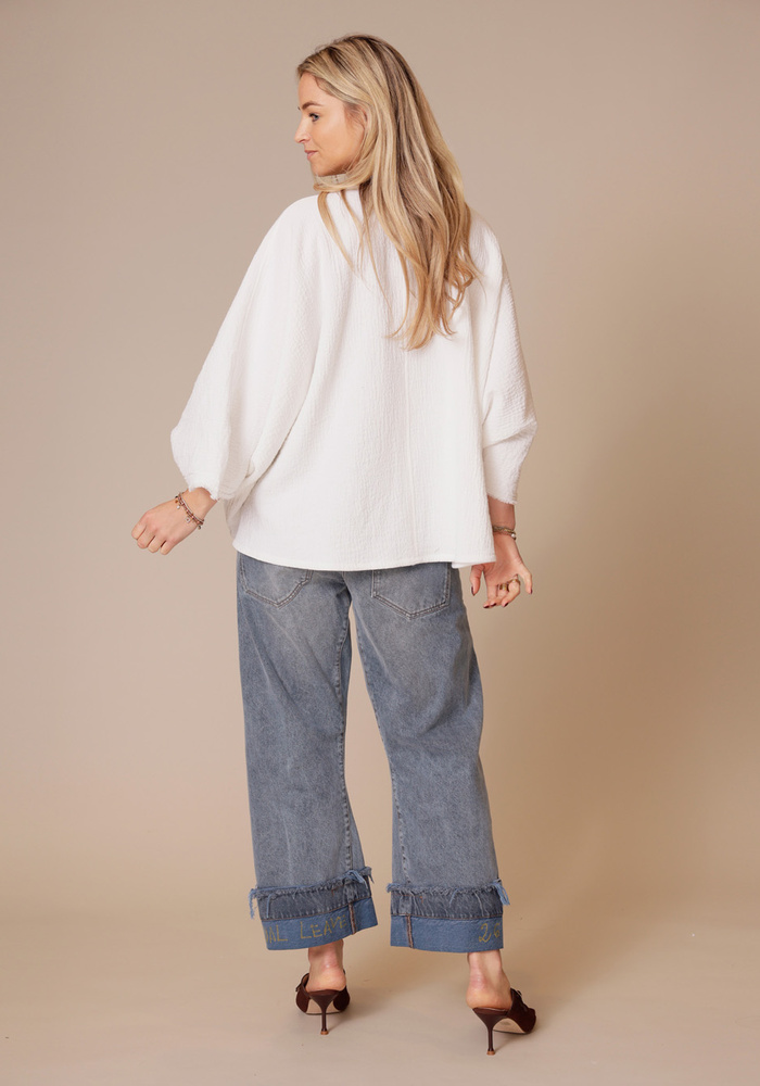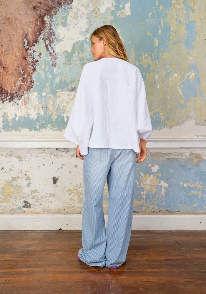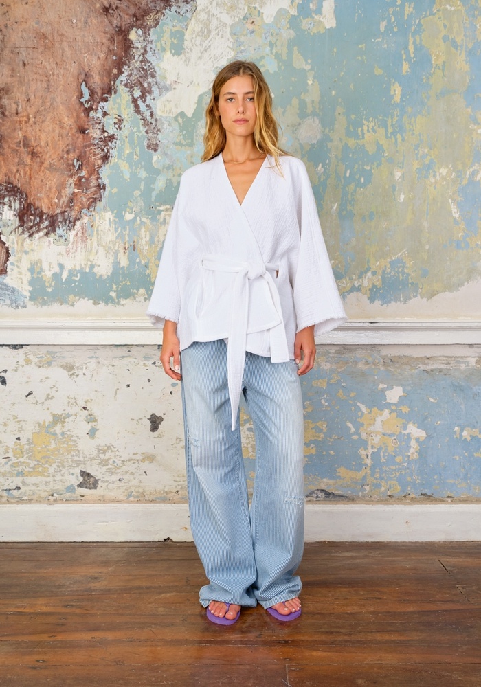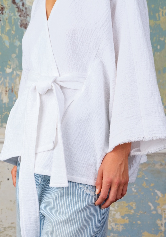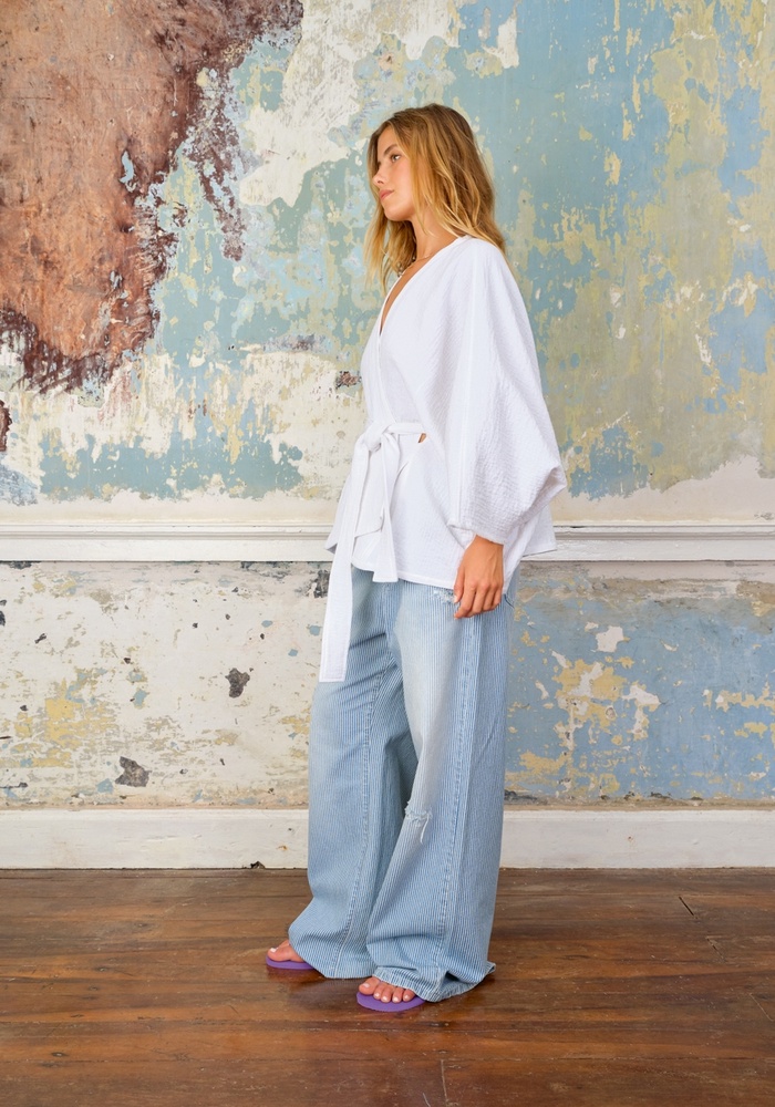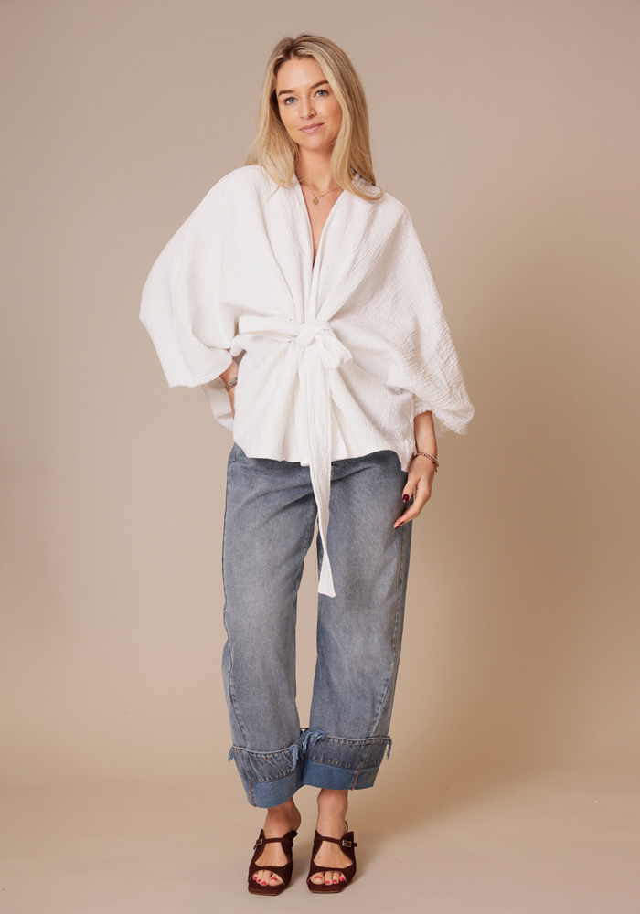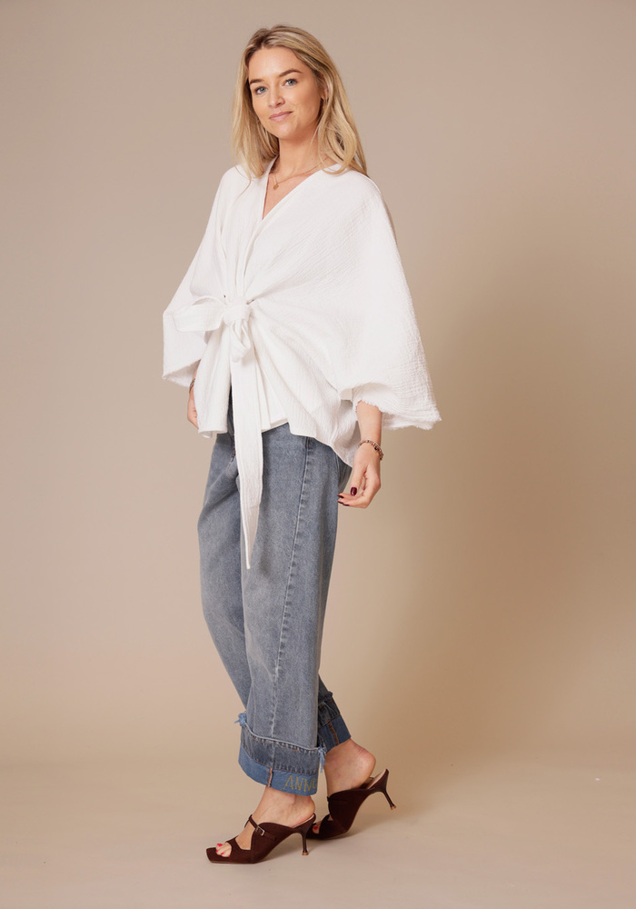 De Ruana cover up van Sea Me Happy is een luchtige, losvallende top in geweven katoen met een ontspannen, elegante uitstraling. Het overslagmodel met strikceintuur in de taille zorgt voor een vrouwelijk silhouet, terwijl de wijde mouwen een speelse en comfortabele touch geven. Dankzij de zachte katoenen kwaliteit is dit item perfect als stijlvolle layer over je outfit, zowel casual als chic te dragen.