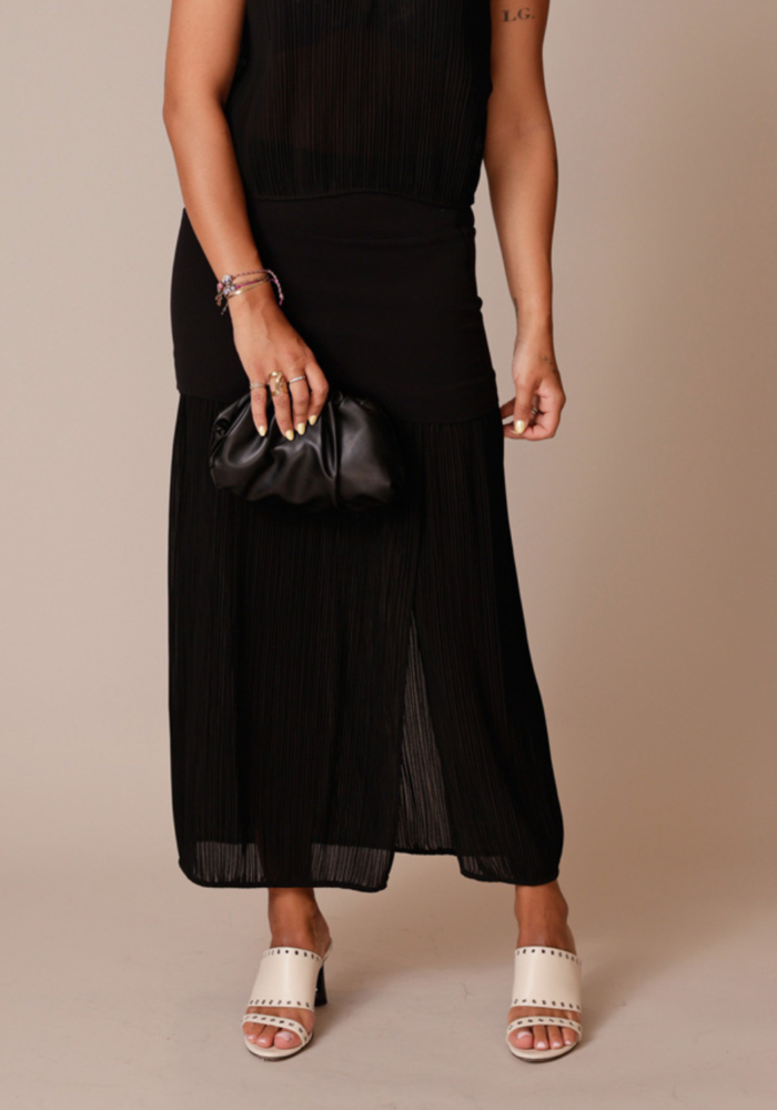 Deze bi-materiaal midi-rok van IRO is een gedurfde mix van structuur en beweging. Bovenaan oogt ze als een korte rok met een brede tailleband en een hoge taillelijn die het silhouet elegant accentueert. Daaronder verrast een fijne, geplisseerde onderrok die speels zichtbaar is dankzij een split aan de voorkant links – een subtiele knipoog naar vrouwelijkheid en vrijheid.