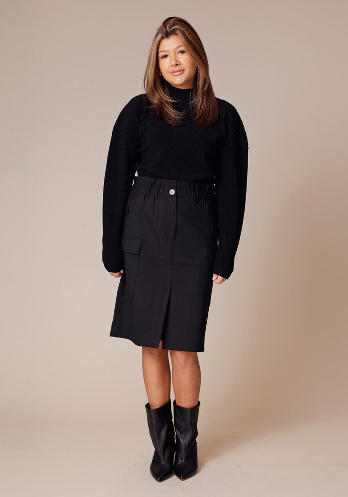 De Carrie skirt van IRO is een wollen rok met een midi-lengte. De rok heeft een elastische tailleband en er kan een riem in gedragen worden.