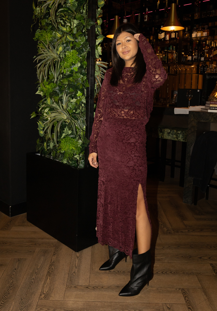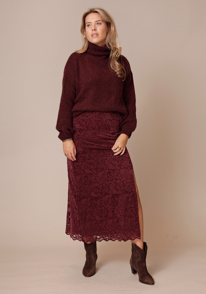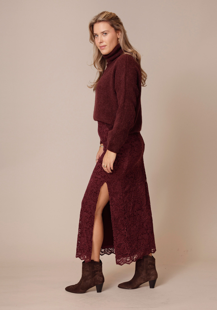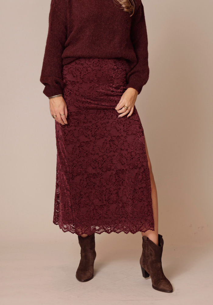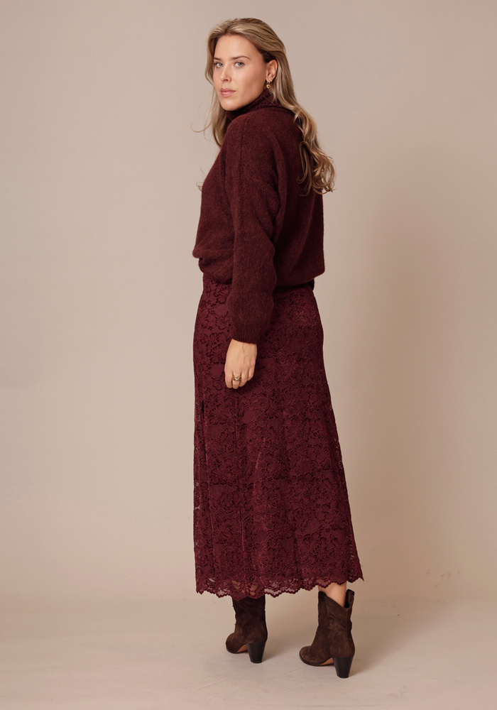 De Dania lace skirt van Rosemunde is een lange kanten rok. De rok heeft een elastische band in de taille en heeft een split aan de zijkant.