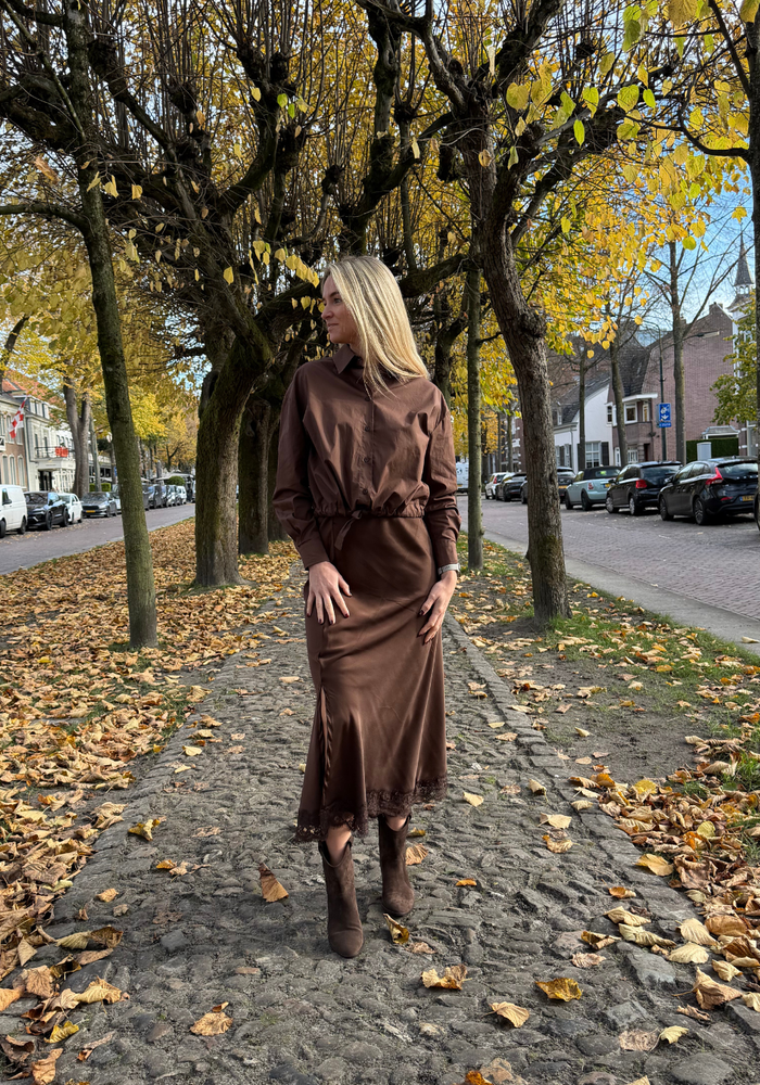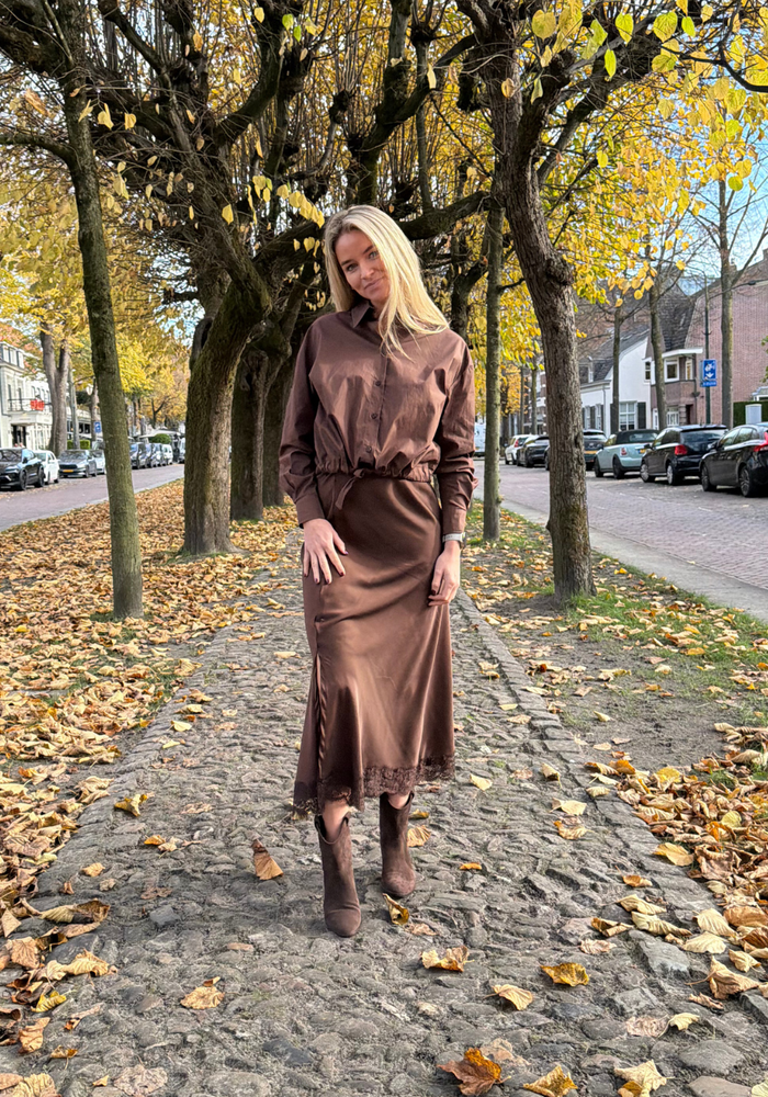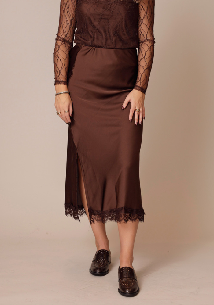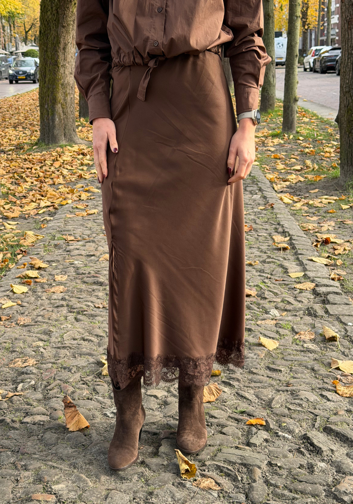 De Lace skirt van Gentle is een lange rok met kanten details. De rok heeft een elastische band in de taille.