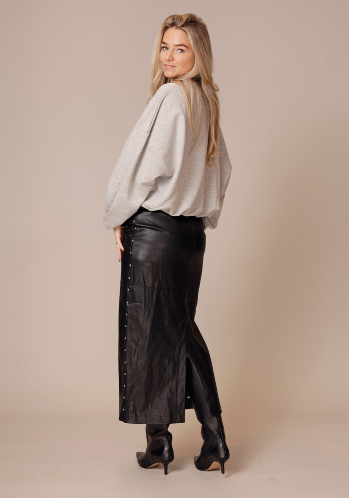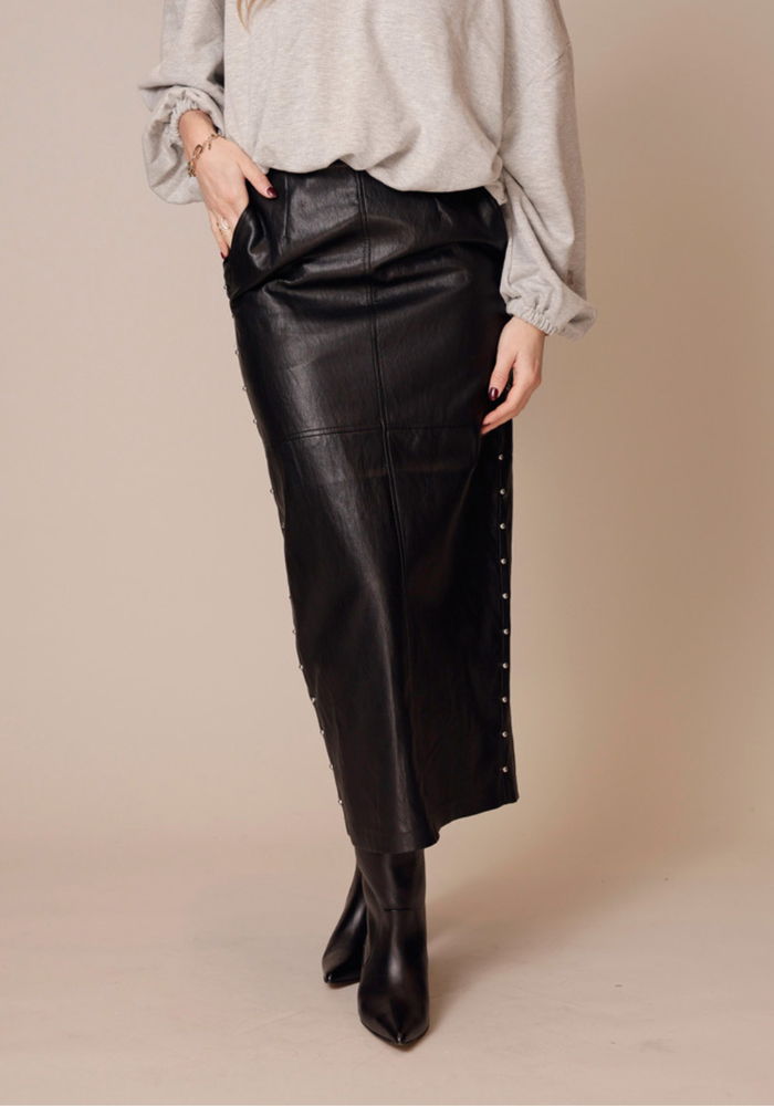 De Gitt stud skirt van Co'couture is een maxi-rok die hoog in de taille valt. De rok heeft stud-details aan de zijkanten.