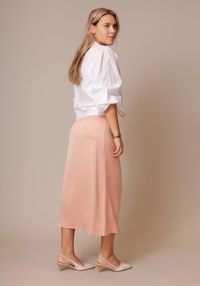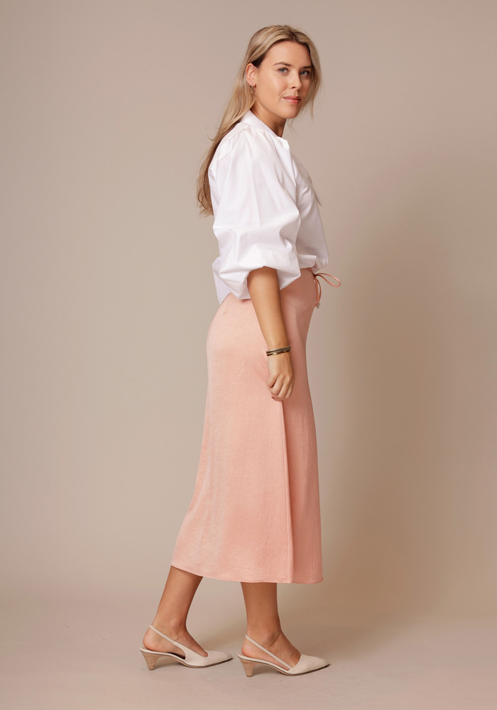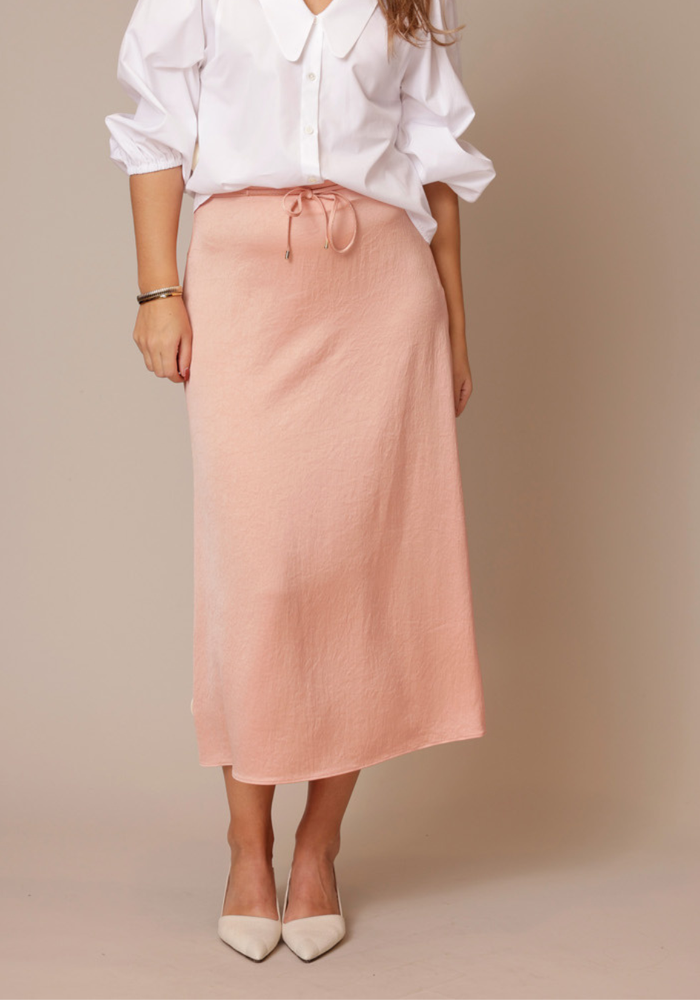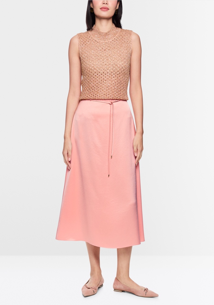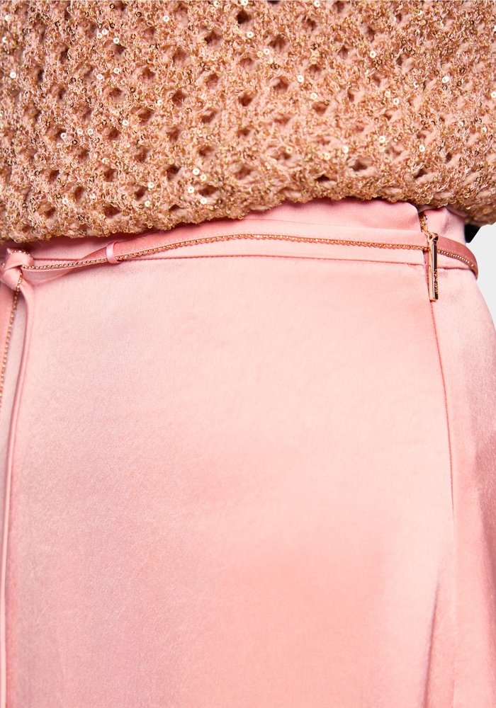 Een elegante, soepelvallende satijnrok op midilengte van Marccain. Hij sluit discreet met een fijne ritssluiting aan de zijkant. De highlight: het strikbandje in de taille met een subtiel glinsterend kettinkje – een stijlvolle eyecatcher met een vleugje glamour.