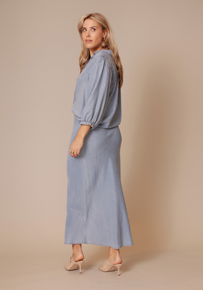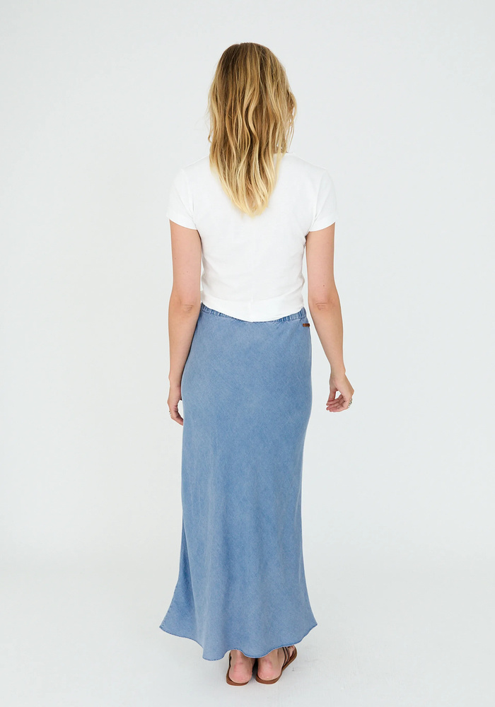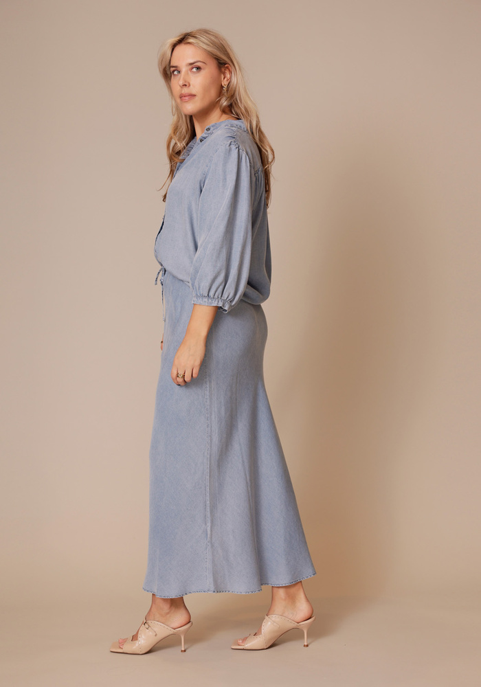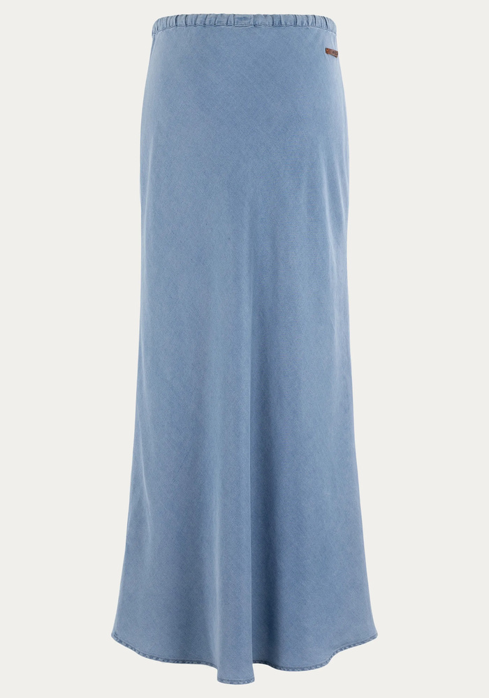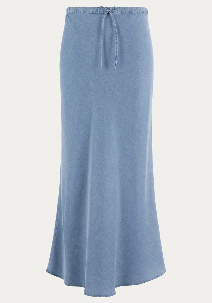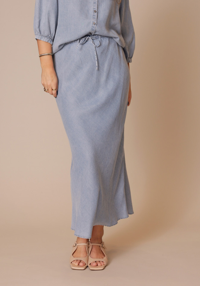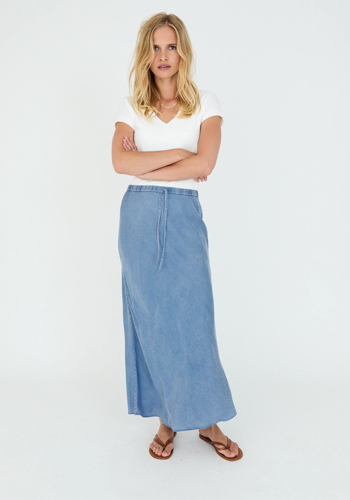 De moscow rok in denimkleur heeft een rechte pasvorm en een elastische tailleband met striksluiting voor optimaal comfort. Gemaakt van soepele lyocell, biedt hij een licht en luchtig draaggevoel, ideaal voor zomerse dagen.