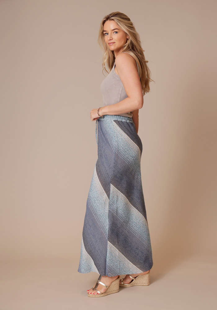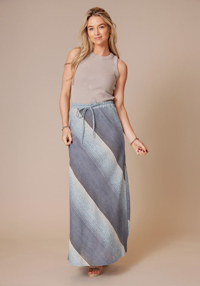 De Praia skirt van Sea Me Happy is een elegante maxi-rok met een klassiek strepenpatroon. De elastische tailleband met strikdetail zorgt voor een comfortabele pasvorm en een vrouwelijke touch, waardoor deze rok perfect is voor zowel casual als zomerse gelegenheden.