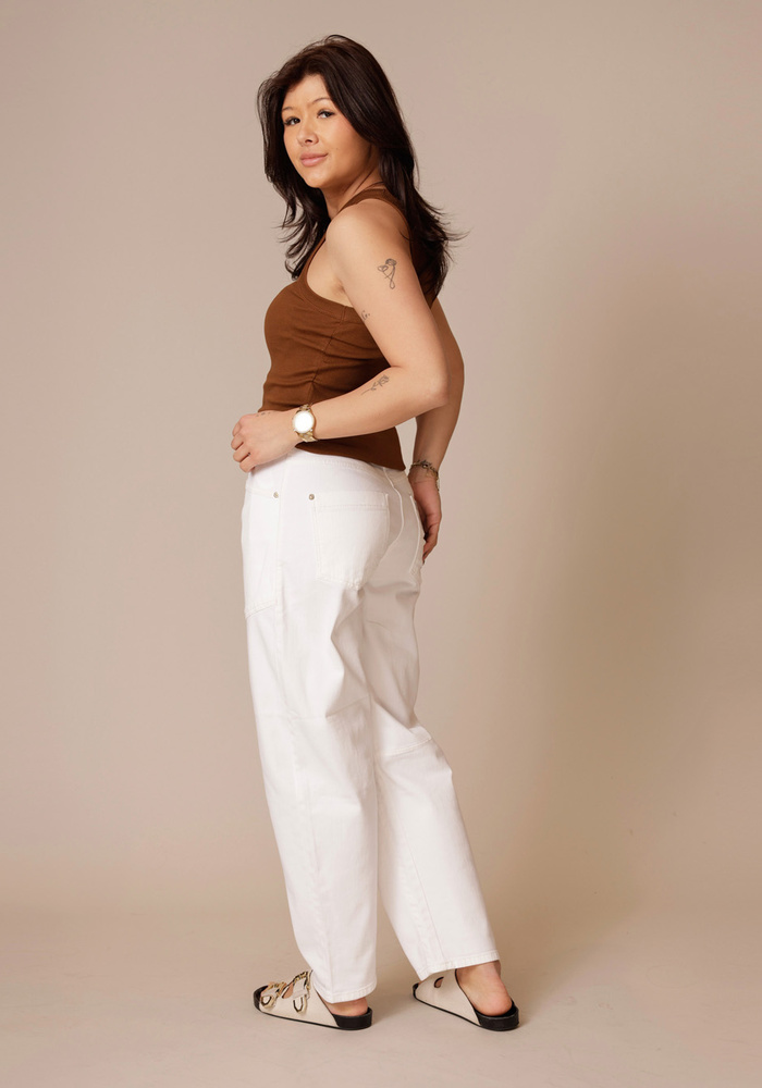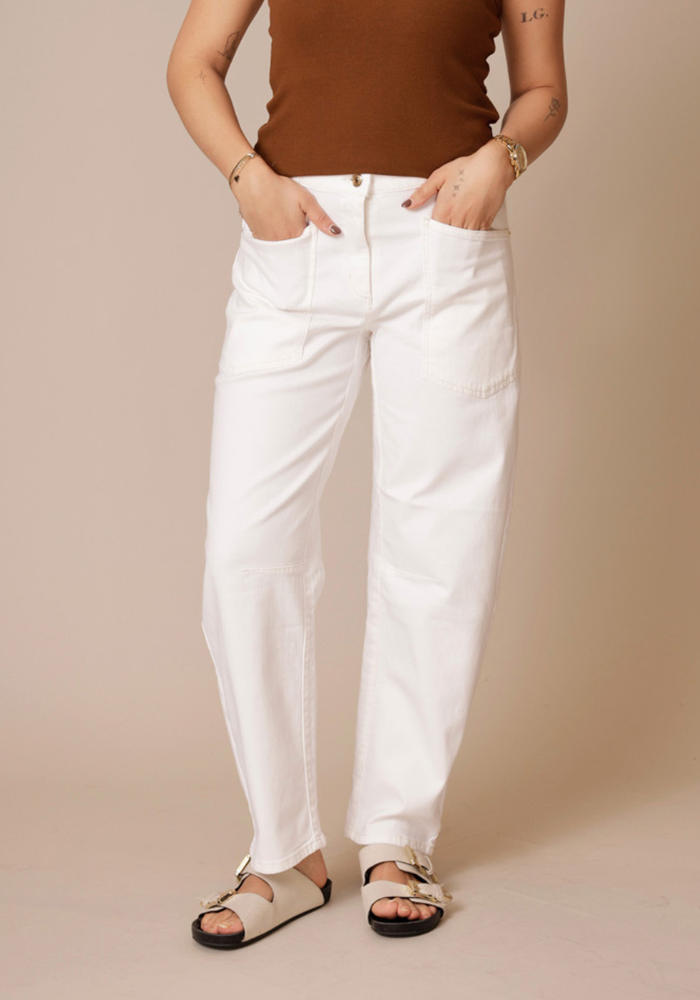 De Ocean jeans van Cambio is een cropped O-shape jeans in zacht ecru denim met een comfortabele, moderne pasvorm. De ronde vorm, grote zakken vooraan en subtiele gouden details geven een eigentijdse uitstraling.