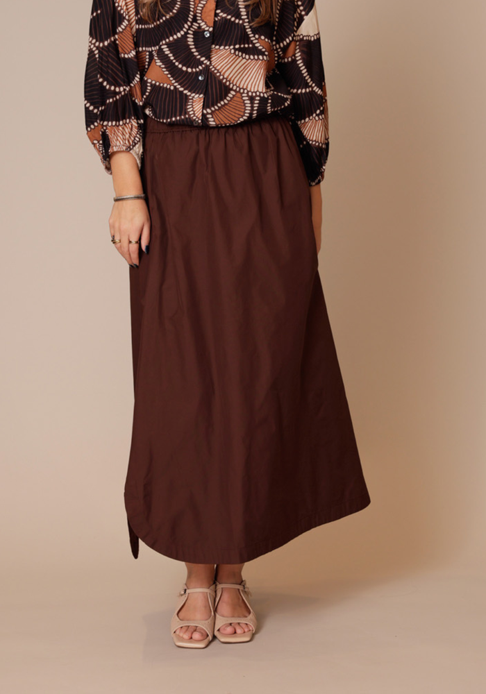 Deze rok van Summum is een lange rok met een elastische band in de taille. De rok is leuk om te combineren met de all-over blouse van Summum.